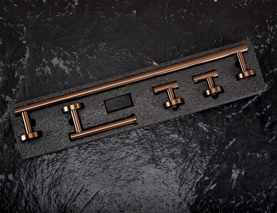 Toate componentele sunt fabricate din metal de înaltă calitate, rezistent la umiditate și coroziune. Finisajul în nuanță de cupru periat adaugă eleganță și un caracter distinctiv, menținându-și rezistența împotriva urmelor de utilizare. Accesoriile se montează pe perete pentru a asigura stabilitate, durabilitate și confort.