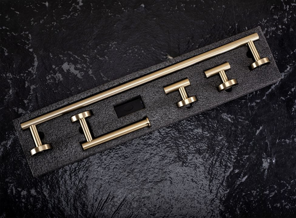 Setul de accesorii pentru baie Ari este o soluție elegantă și practică ce aduce armonie și un stil modern băii tale. Setul conține un suport pentru prosop, un suport pentru hârtie igienică și două cârlige funcționale – formând un ansamblu coerent și estetic, indispensabil în utilizarea zilnică. Toate elementele sunt realizate din metal de înaltă calitate, rezistent la umiditate și coroziune. Suprafața în nuanță de auriu periat oferă eleganță și un luciu subtil, păstrând rezistența la urmele de utilizare. Accesoriile se montează pe perete, asigurând stabilitate, durabilitate și confort. Setul Ari îmbină simplitatea formei cu estetica atemporală. Designul său minimalist se potrivește perfect atât băilor clasice, cât și celor moderne, creând un spațiu armonios, funcțional și elegant.