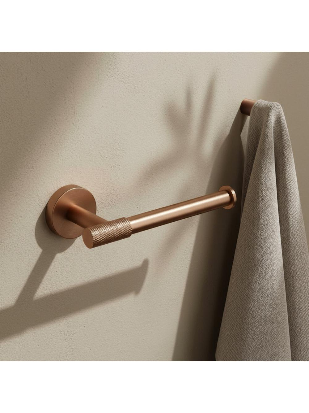 Construcția solidă din metal conferă durabilitate și rezistență la umiditate, fiind ideal pentru folosirea în baie. Detaliul decorativ texturat adaugă un aspect industrial și contemporan suportului. Montarea pe perete asigură stabilitate maximă și fixare sigură, iar designul său minimalist, cu rozeta rotundă și liniile curate, se potrivește perfect în băile moderne sau în cele de tip loft.