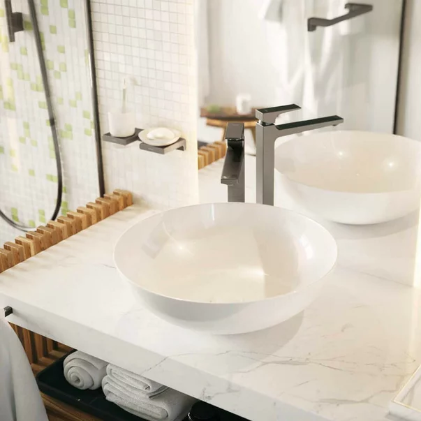Adăugarea accesoriilor AddStoris la instalațiile de baie Hansgrohe creează un aspect general coerent, în care totul se armonizează.