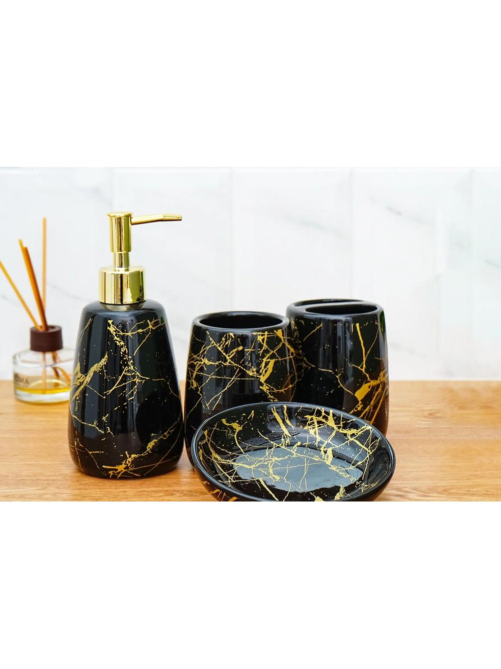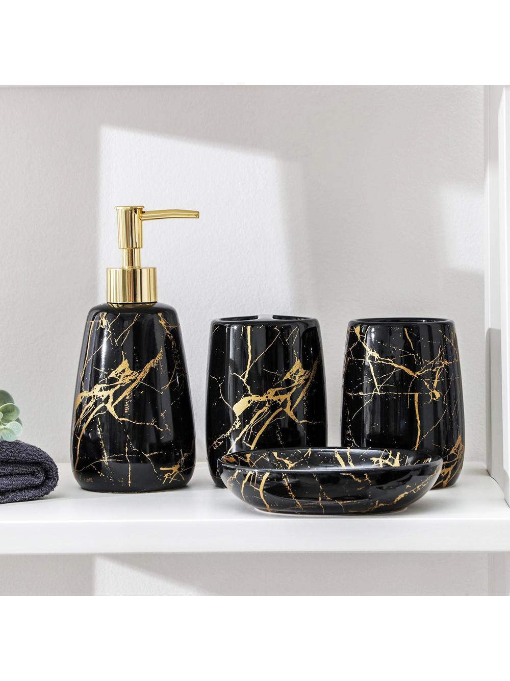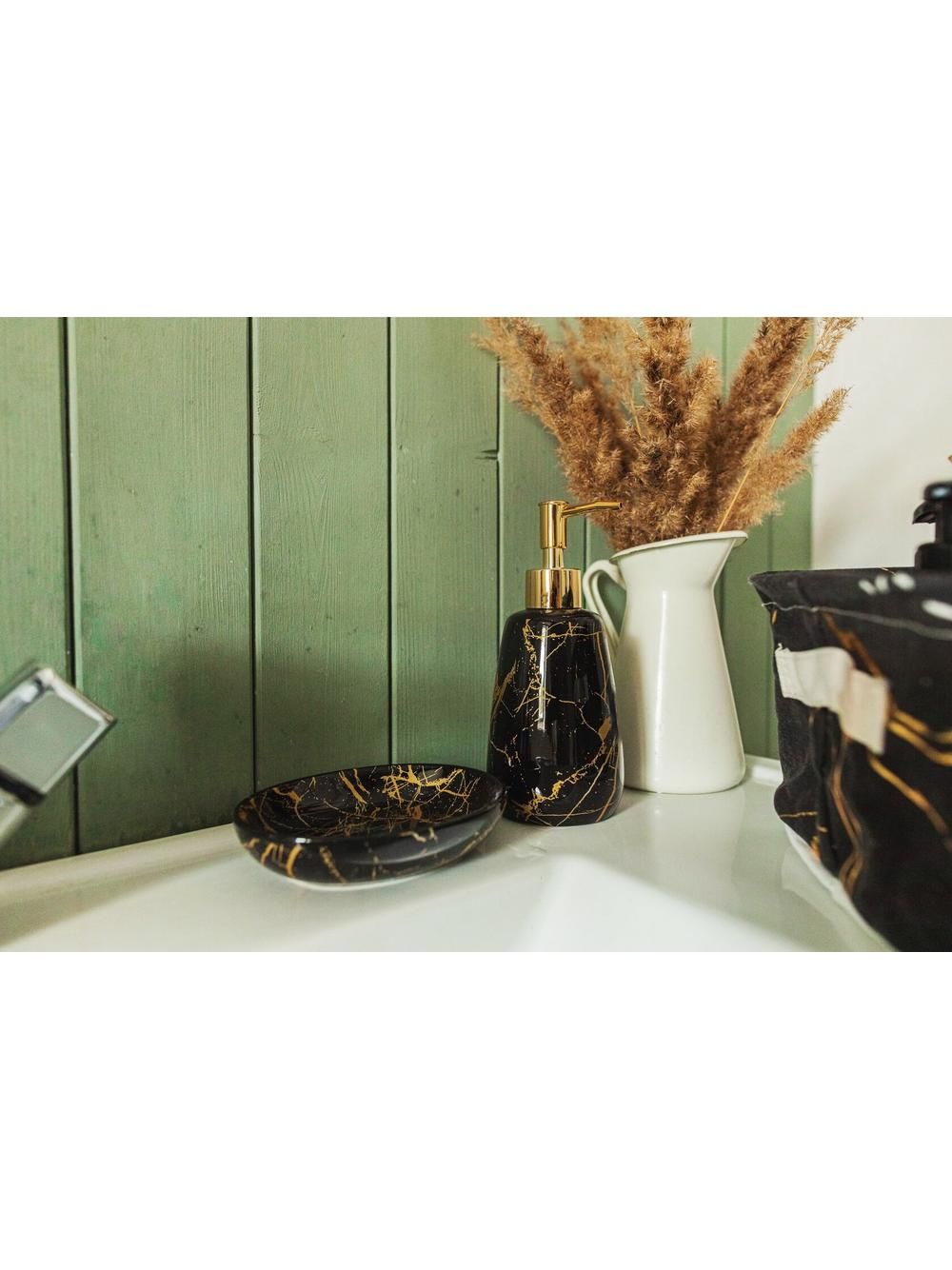 Un set de baie practic și elegant, format din trei elemente: Dozator pentru săpun lichid, pahar de baie și suport pentru săpun. Setul este realizat din ceramică sanitară, iar finisajul său original va completa orice decor de baie.