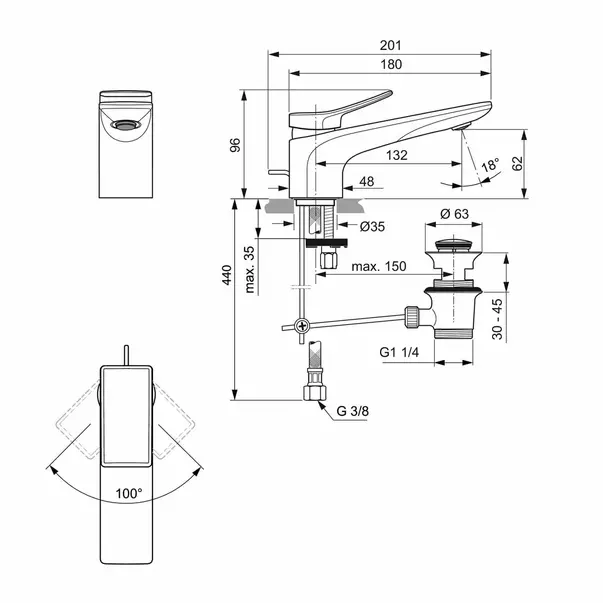 Specificatii tehnice Baterie lavoar Ideal Standard Atelier Conca gri Magnetic Grey cu ventil Pop-Up: