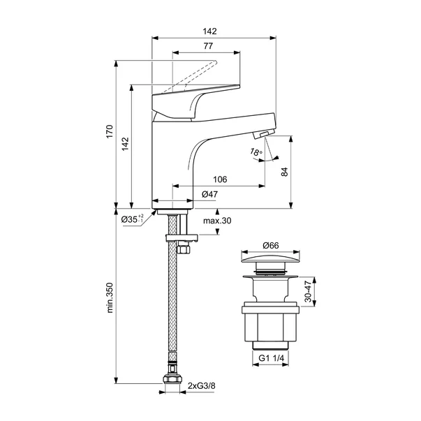 Specificatii tehnice Baterie lavoar Ideal Standard Cerabase H80 crom lucios cu ventil Click-Clack:
