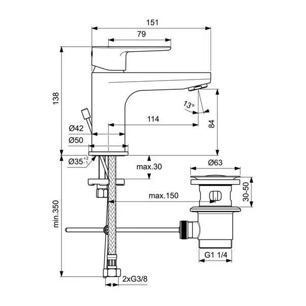 Specificatii tehnice Baterie lavoar Ideal Standard Cerafine O H80 crom lucios cu ventil metalic: