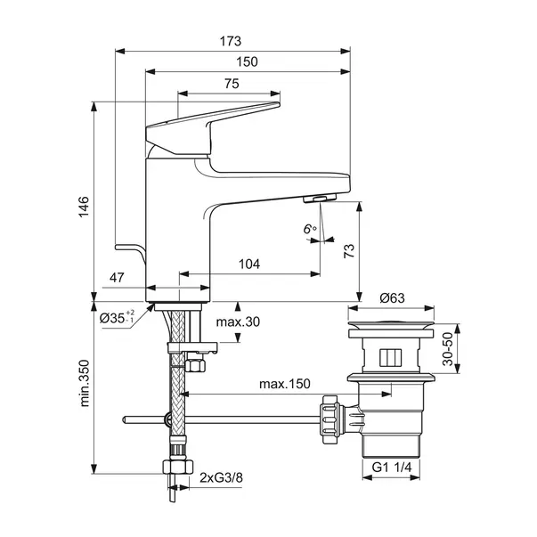 Specificatii tehnice Baterie lavoar Ideal Standard Ceraplan H75 crom lucios cu ventil: