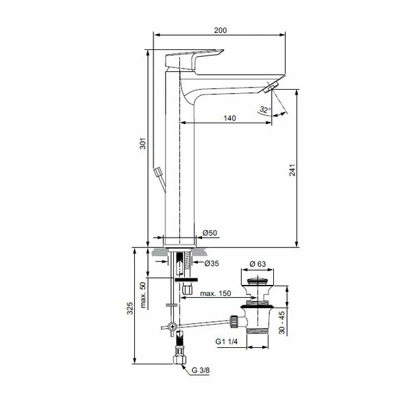Specificatii tehnice Baterie inalta Ideal Standard Tesi pentru lavoar pe blat: