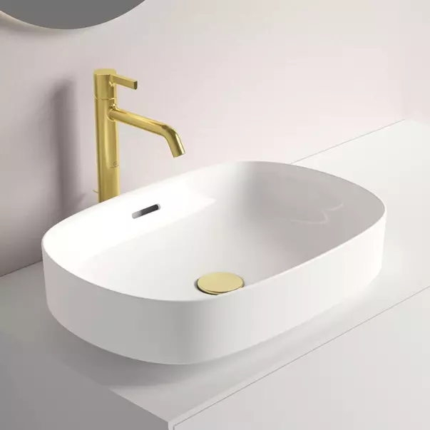 Finisajele din paleta de alamă pot fi combinate cu ceramică și mobilierul nostru pentru a crea declarații vizuale puternice - sinergia perfectă între formă, material și culoare.