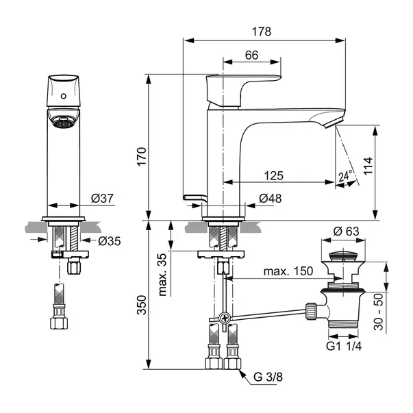 Specificatii tehnice Baterie lavoar tip Grande Ideal Standard Connect Air gri Magnetic Grey cu ventil metalic: