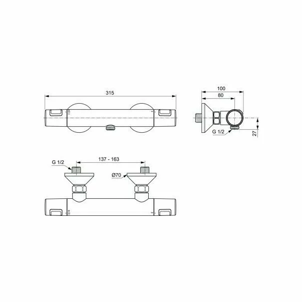 Aceasta baterie de dus de la Ideal Standard este fabricata din alama sanitara, cu dimensiunile de 315 x 100 mm si finisaj cromat. Dispune de cartus termostatat pentru reglarea temperaturii si corpul rece la atingere. De asemenea, are un buton de limitare a temperaturii la 40° C si un buton pentru consum redus de apa cu 50%. Bateria mai este echipata cu o valva anti-retur pentru functionalitate sporita.