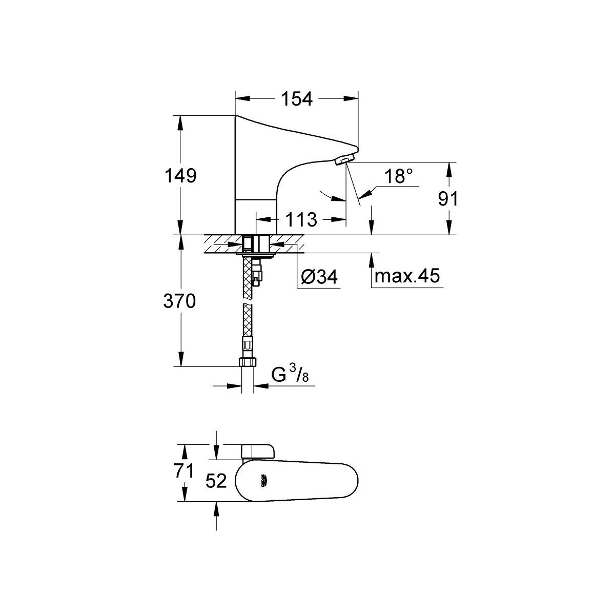 - electronice în infraroșu cu mixer- pentru lavoar- alimentarea cu energie bat. baterie cu litiu CR-P2 de 6 V- montare cu o singură gaură- mixer cu blocare pentru apă caldă- baterie cu durată de viață lungă- durata de viață a bateriei: aprox. 7 ani (150 cicluri/zi)- indicator de stare a bateriei în mai multe trepte- sistem de instalare rapidă- 7 pre-programe- spălare automată 24/72 ore.- cu spălare temporizată sau manuală- mod de curățare- deconectare de siguranță după 60 sec.- funcții suplimentare prin intermediul telecomenzii cu infraroșu 36206000- timp de spălare reglabil- zonă de detecție reglabilă cu dezinfecție termică 3,5 min. sau 11 min.- Aerator Grohe EcoJoy® 5,7 l/min- furtunuri de conectare flexibile pentru apă rece sau amestecată- supapă de reținere- supapă magnetică- capcană de murdărie- Clasa de volum I în conformitate cu DIN 4109- clasa de siguranță IP 57- marca CE- Tehnologie Grohe EcoJoy® pentru un consum redus de apă- presiune minimă de 1,0 bar- acoperire cromată cu Grohe StarLight®.