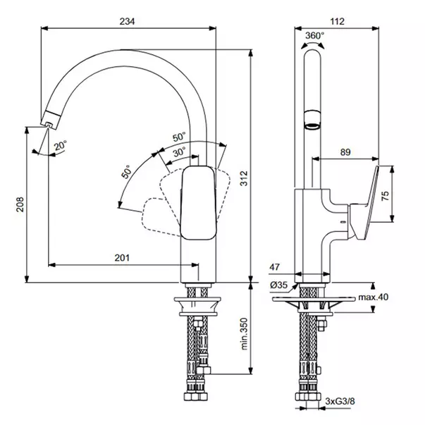 Specificatii tehnice Baterie bucatarie Ideal Standard Ceraplan cu presiune joasa: