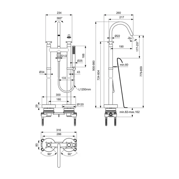 Specificatii tehnice Baterie cada - dus freestanding Ideal Standard Atelier Joy Neo crom lucios dubla comanda: