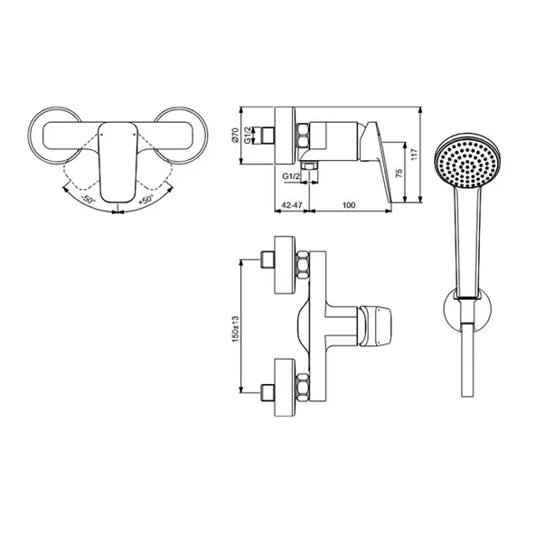 Specificatii tehnice Baterie dus cu monocomanda Ideal Standard Ceraplan si set de dus: