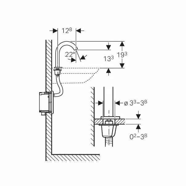 Baterie electronică pentru lavoar Geberit Piave cu alimentare de la rețea, potrivită pentru cutia funcțională încorporată.