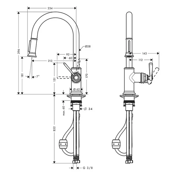 Specificatii tehnice Baterie bucatarie cu dus extractibil Hansgrohe Axor Montreux 180: