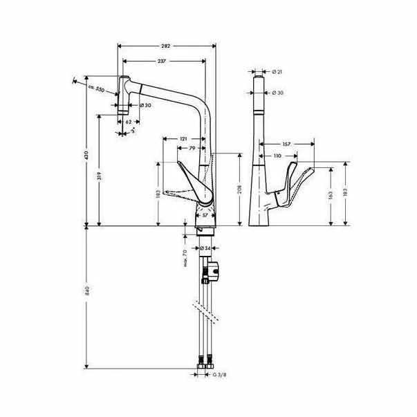 Specificatii tehnice Baterie bucatarie cu dus extractibil Hansgrohe Metris M71 320 inox 2 functii: