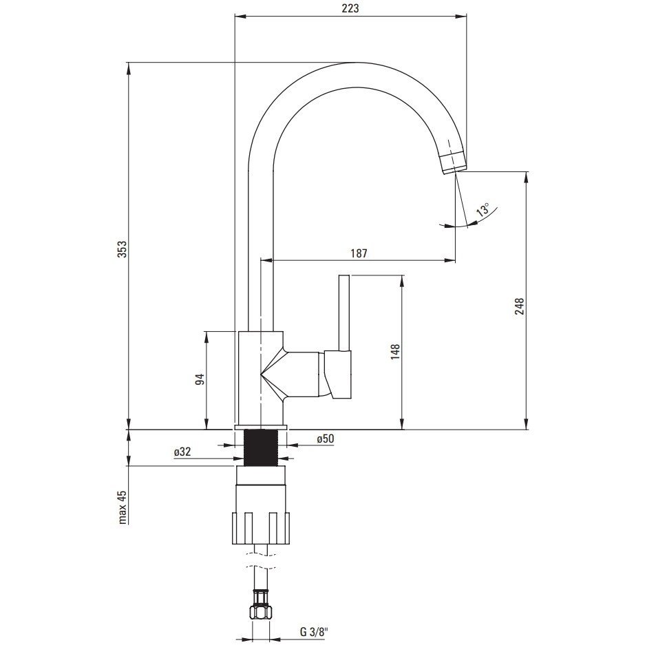 Specificatii tehnice Baterie bucatarie Deante Aster H353 mm crom: