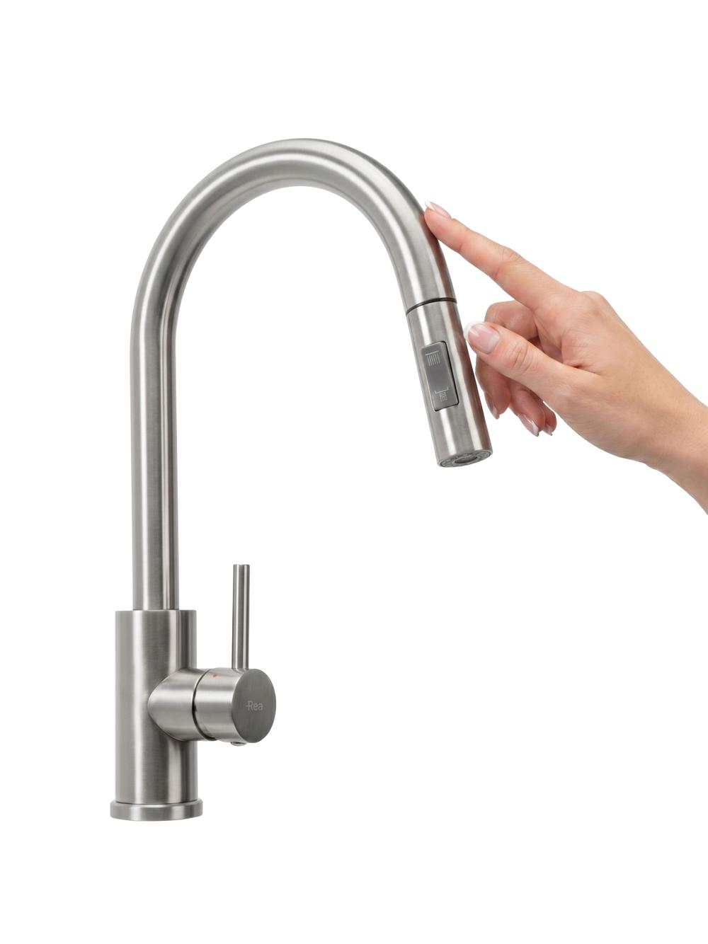 Combinați designul modern cu funcționalitatea cu ajutorul bateriei de bucătărie Rea Fresh Touch, disponibilă într-un elegant finisaj periat. Acest model este dotat cu sistemul tactil Touch, care permite activarea și dezactivarea rapidă a apei printr-o simplă atingere a bateriei, fără a fi nevoie să utilizați mâinile. Bateria dispune de o pipă extractibilă, care extinde zona de acțiune și facilitează activitățile zilnice precum spălarea vaselor sau curățarea chiuvetei. Datorită perelei bifuncționale, puteți schimba cu ușurință modul de jet al apei în funcție de necesități.