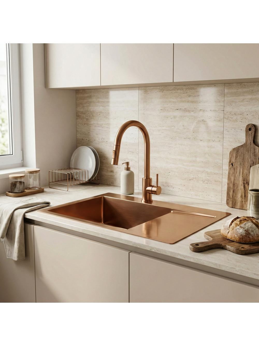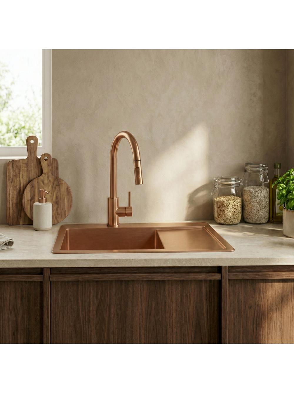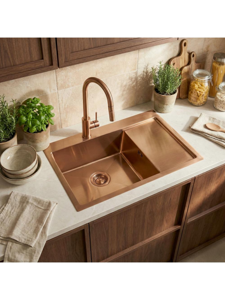 Chiuveta din oțel inoxidabil Fin, cu finisaj în cupru periat, se distinge prin designul său modern și caracterul său practic, fiind ideală pentru bucătăria ta. Fabricată din oțel inoxidabil de înaltă calitate AISI 304 (cu o grosime de 2 mm), această chiuvetă este extrem de rezistentă la coroziune, zgârieturi și temperaturi ridicate, fiind durabilă și fiabilă pe termen lung. Cu o capacitate generoasă și o adâncime considerabilă, oferă un confort deosebit în utilizarea de zi cu zi. Chiuveta este echipată cu un orificiu pentru montarea rapidă și ușoară a bateriei, iar ventilul de scurgere asortat cromatic completează aspectul unitar și elegant al produsului. Suprafața sa igienică și ușurința în curățare a elementelor netede contribuie la menținerea curățeniei și la prevenirea dezvoltării microorganismelor. Poți alege între două variante: chiuvetă fără baterie sau chiuvetă în set cu bateria de bucătărie Fresh, ce dispune de o pipă extractibilă.