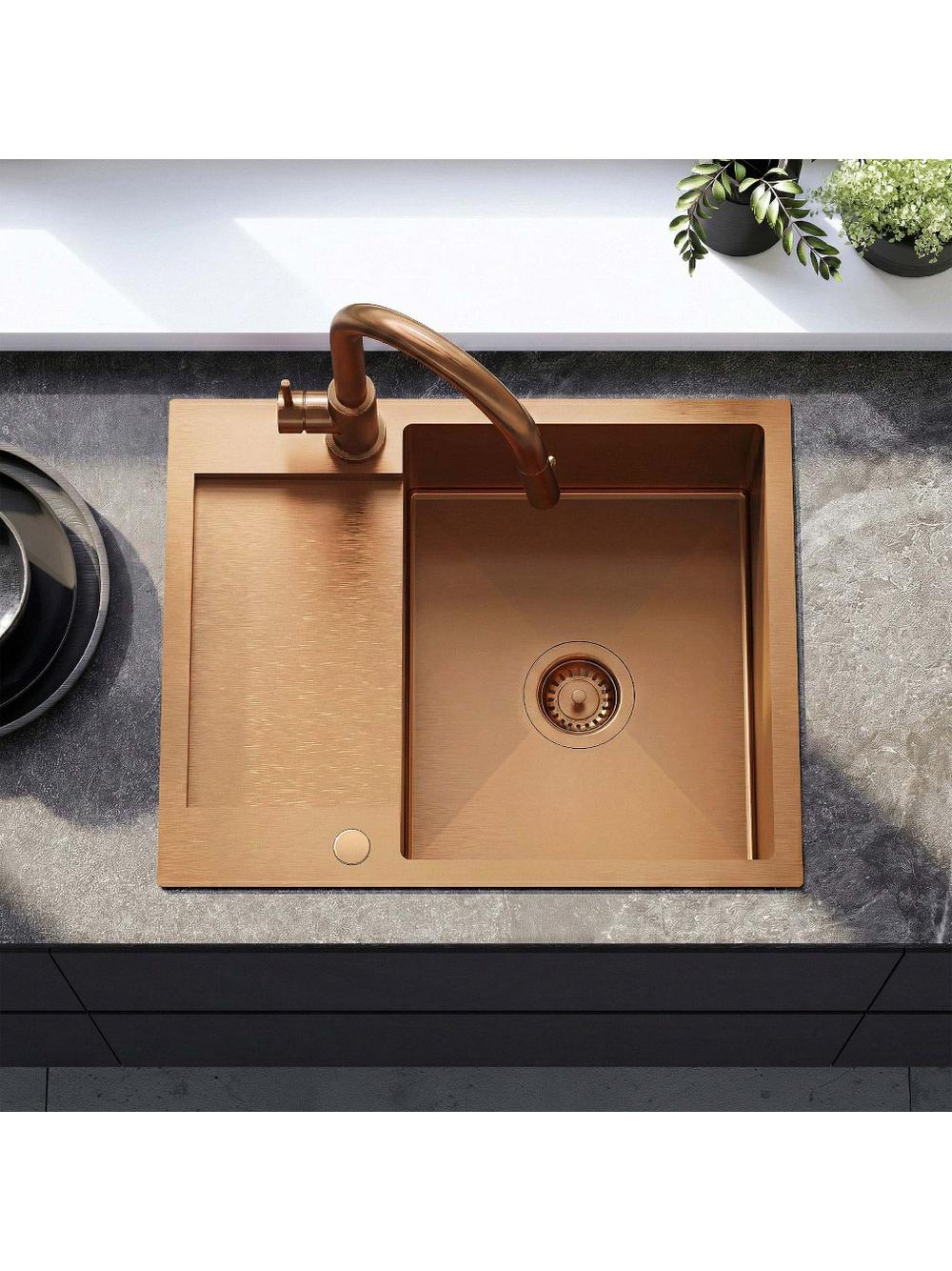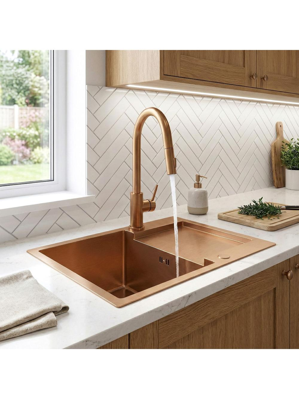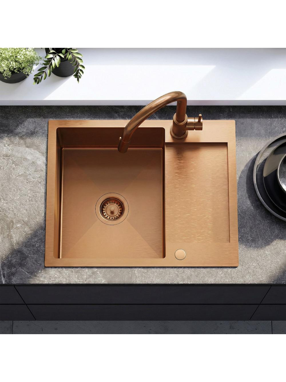 Chiuveta din oțel inoxidabil Paul, cu finisaj cupru periat, combină eleganța designului modern cu utilitatea practică, fiind perfectă pentru orice bucătărie. Această chiuvetă de înaltă calitate, fabricată din oțel inoxidabil AISI 304 (cu o grosime de 2 mm), se remarcă prin rezistența sa la coroziune, zgârieturi și temperaturi ridicate, fiind durabilă și fiabilă pe termen lung. Cu o cuvă adâncă și spațioasă, această chiuvetă oferă confort în utilizarea zilnică. Cu un orificiu dedicat pentru montarea rapidă și ușoară a bateriei, produsul include și un ventil de scurgere asortat cromatic, pentru un aspect uniform și elegant. Suprafața ușor de curățat și igienică ajută la menținerea chiuvetei în condiții impecabile și previne dezvoltarea microorganismelor. Disponibil în două opțiuni: fără baterie sau într-un set care include bateria de bucătărie Fresh cu pipă extractibilă.
