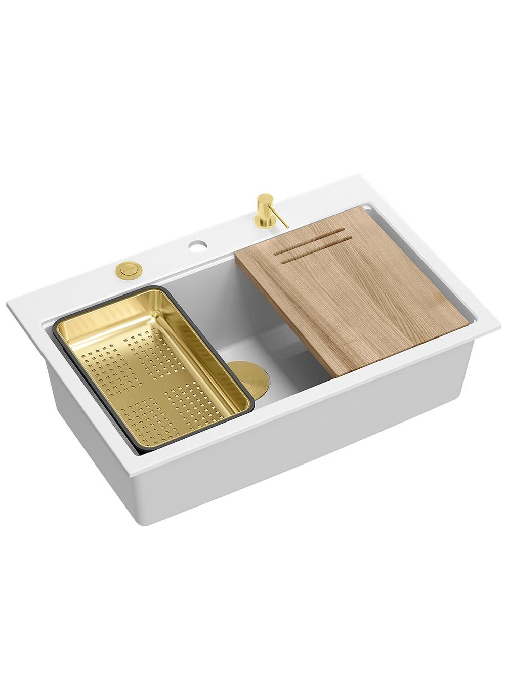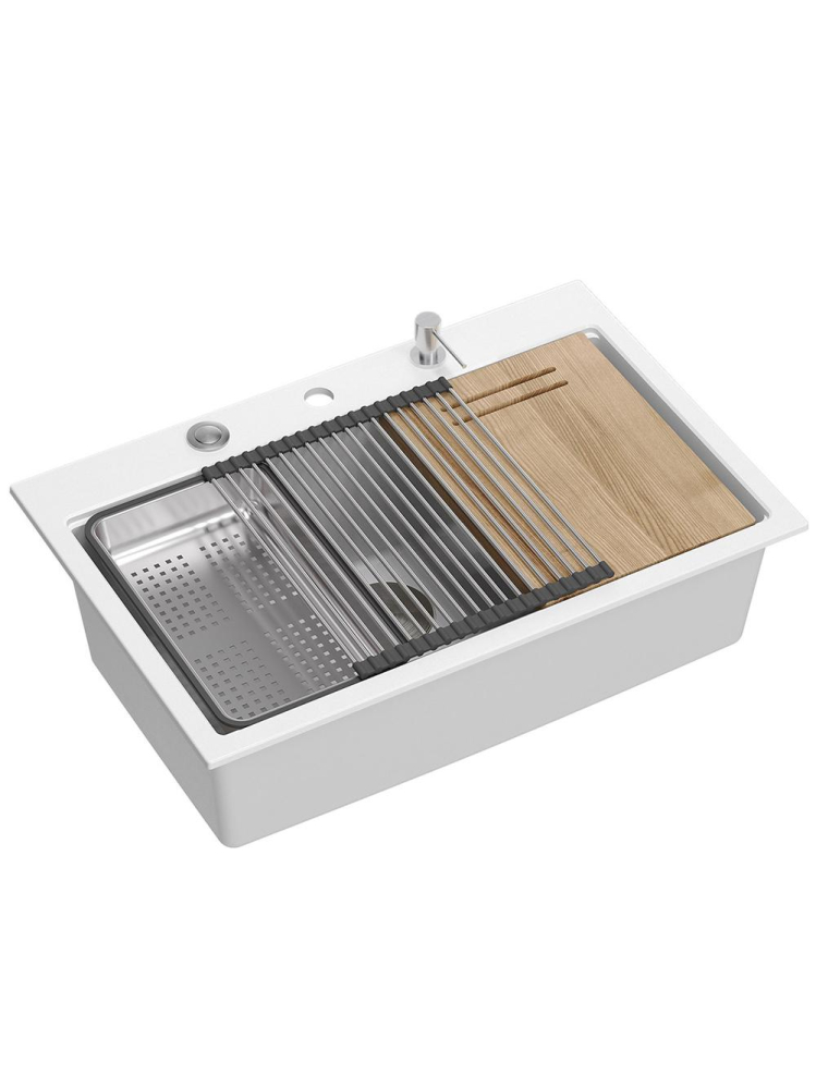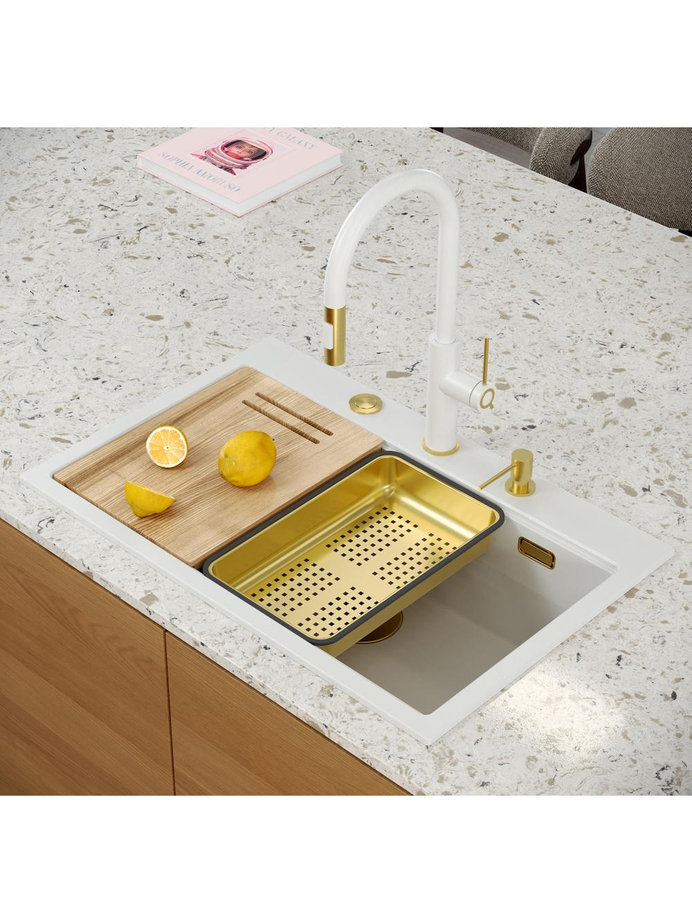 Acest model este echipat bogat cu accesorii suplimentare de bucătărie. Vine cu un dozator de lichid, o placă de tăiat din bambus, un scurgător și un covoraș laminat din oțel-silicon (nu este inclus în set la variantele aur și cupru).