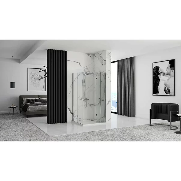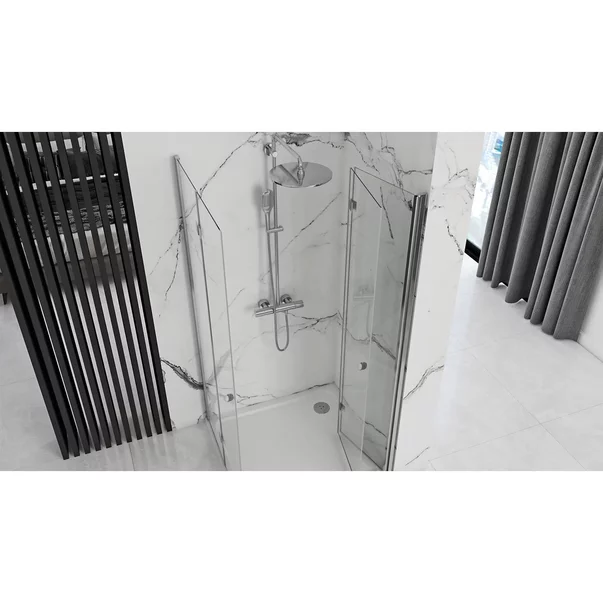 Cabina de duș Foldeste formată din două uși pliante din sticlă, finisate cu elemente elegante cromate. Fiecare aripă poate fi pliată pe perete, atât în interior cât și în exterior.