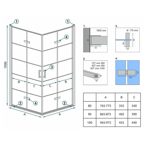 Specificatii tehnice Cabina de dus patrata pliabila Rea Molier 80x80 negru: