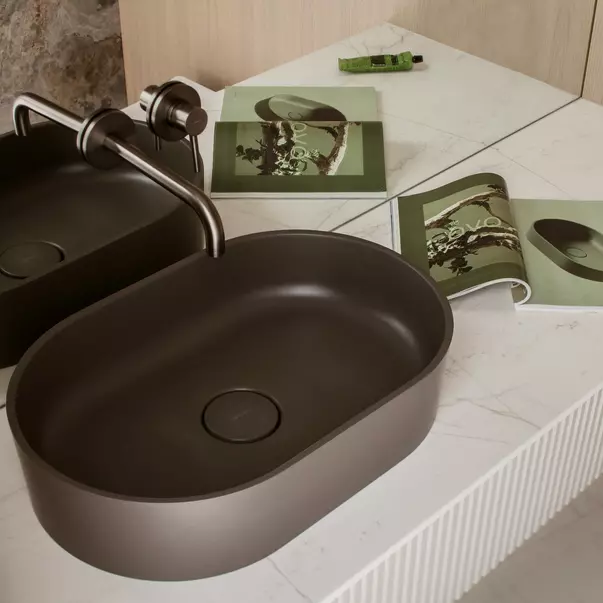 Lavaboul OVO în Gri Cenușiu (RAL7022) are o suprafață mată catifelată, într-o nuanță elegantă și caldă de gri.