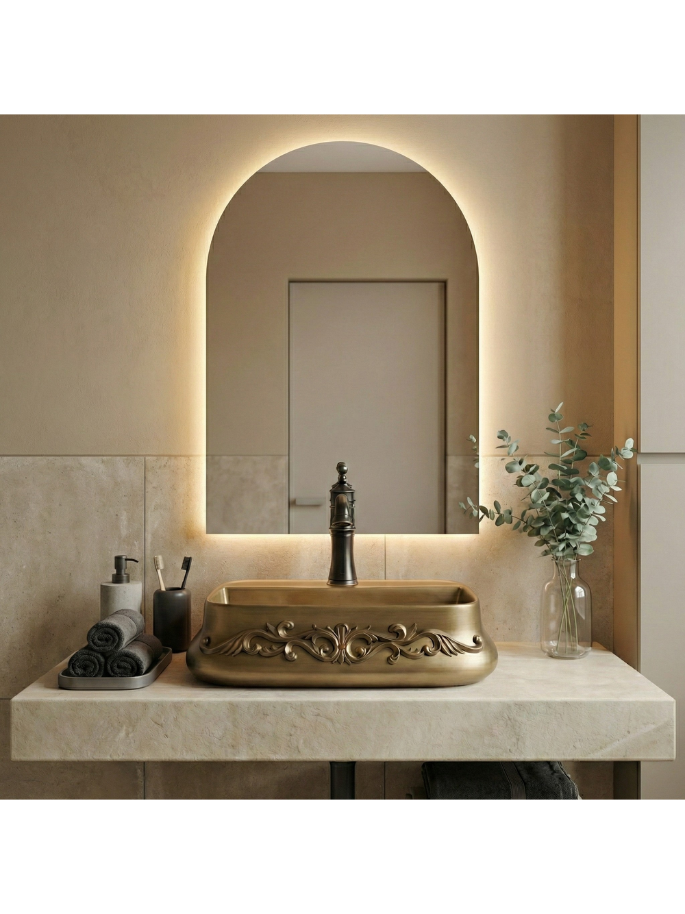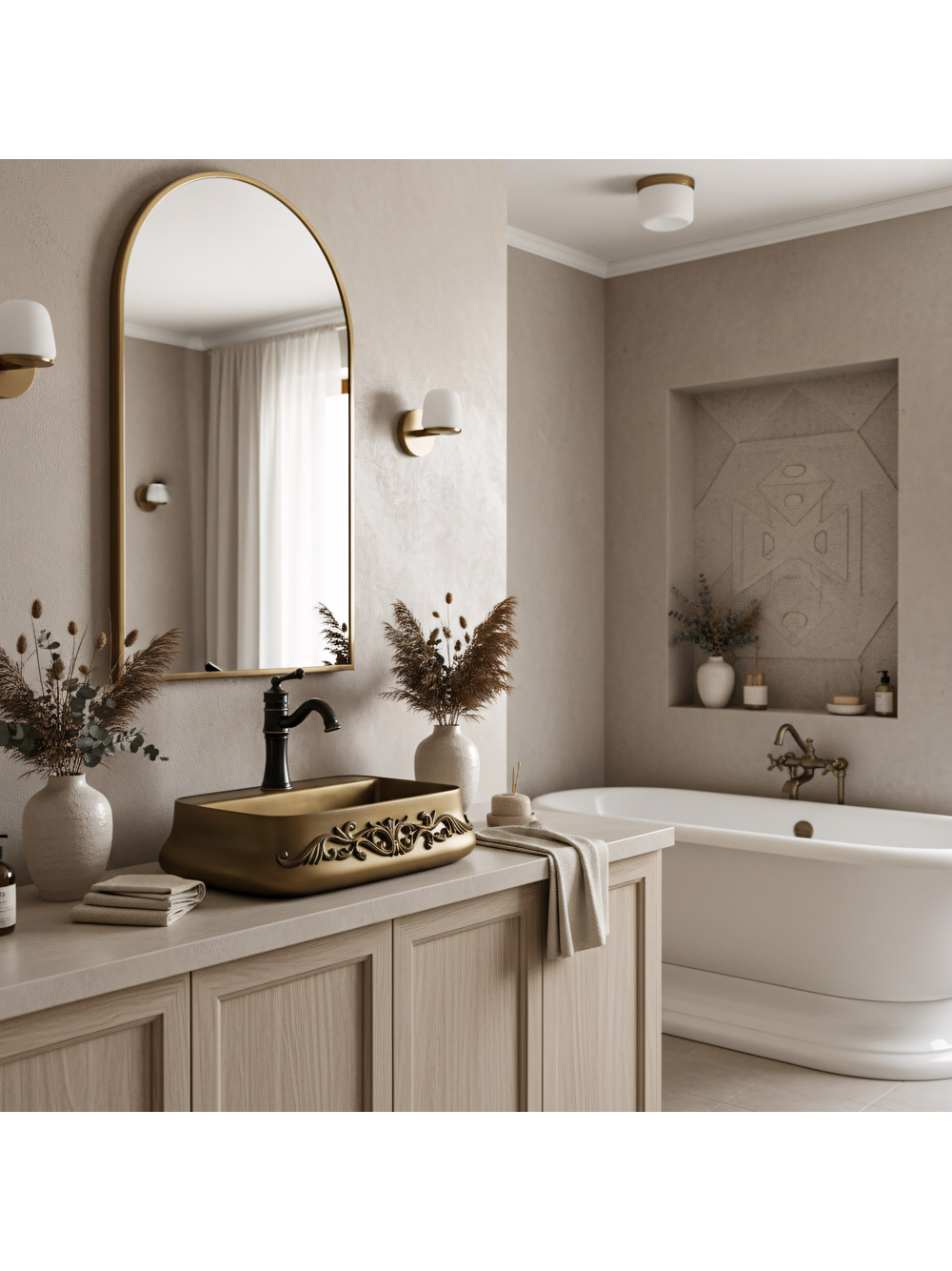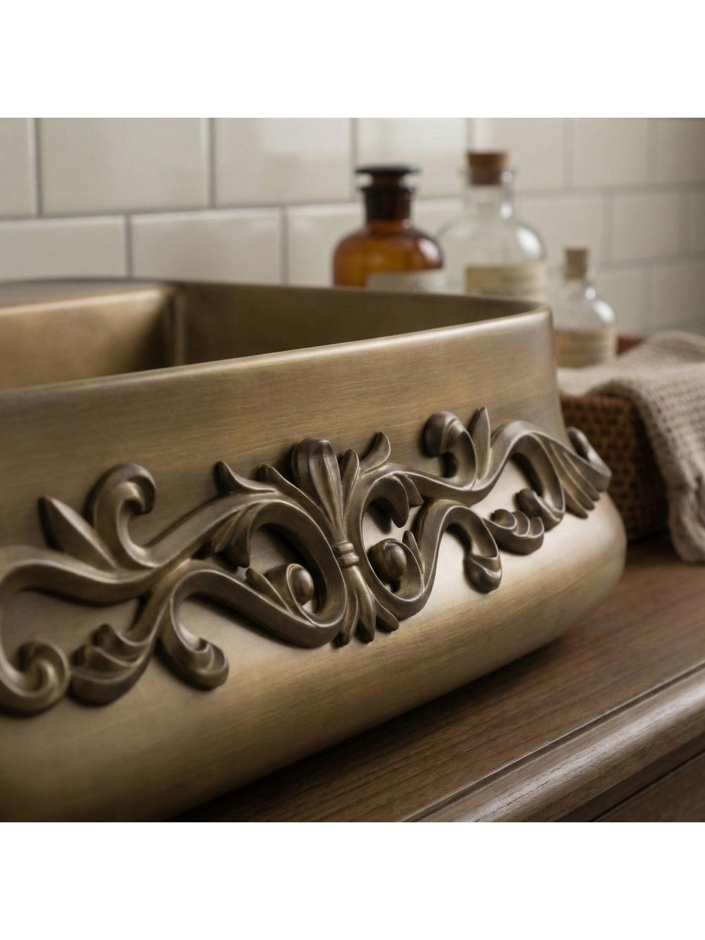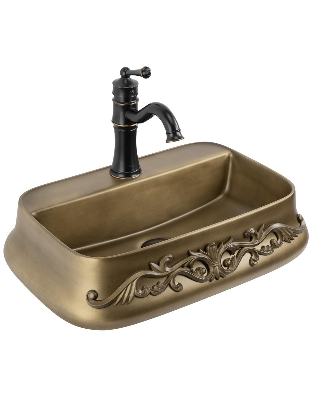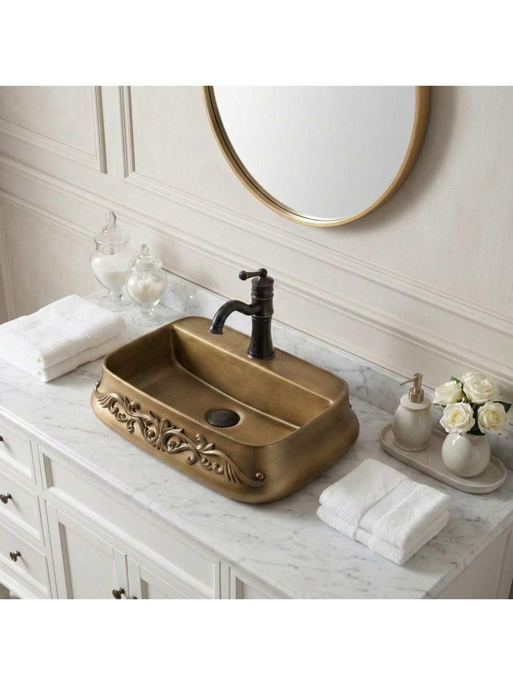 Alegeți lavoarul ceramic pe blat Rea Castel pentru a aduce un accent clasic și expresiv în baia dvs. Această piesă este ideală pentru cei care apreciază stilul retro, vintage și rustic, combinând forme funcționale cu ornamente bogate și spectaculoase. Ornamentele deosebite în relief de pe partea frontală a lavoarului adaugă un aer elegant și artizanal în baie. Finisajul în nuanță de alamă antichizată conferă ceramicii un aspect de bronz patinat, subliniind stilul vintage și adăugând o notă de nobilime. Lavoarul are o poliță incorporată cu orificiu pentru baterie, facilitând montajul acesteia direct pe lavoar, protejând astfel blatul de stropire și făcându-l mai ușor de curățat. Realizat din ceramică durabilă, acest lavoar asigură întreținere ușoară, o suprafață interioară netedă și rezistență la decolorare. Montat pe blat, lavoarul Rea Castel pune în valoare carcasa decorată și marginile profilate, cu linii fluide. Este un detaliu statement care poate transforma complet caracterul băii, potrivindu-se perfect în amenajările clasice, „conac” sau eclectic, creând un spațiu coerent și elegant.