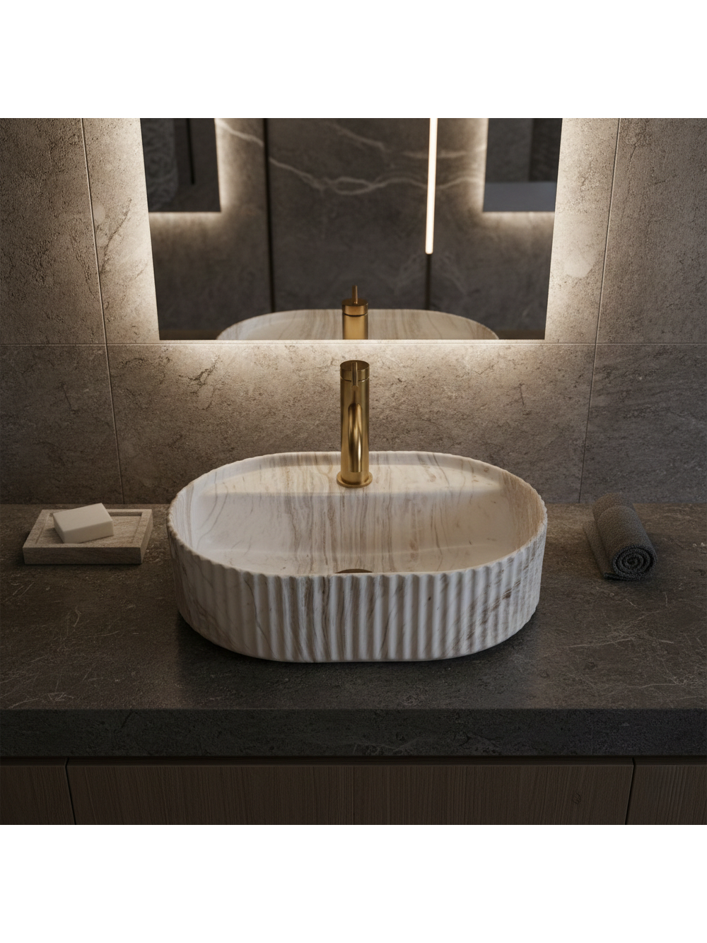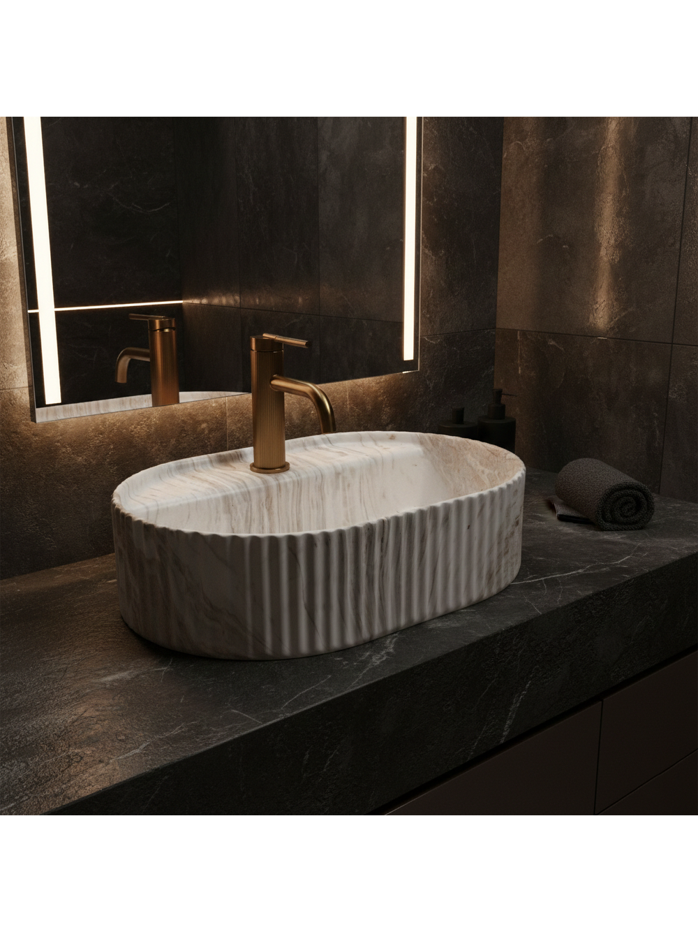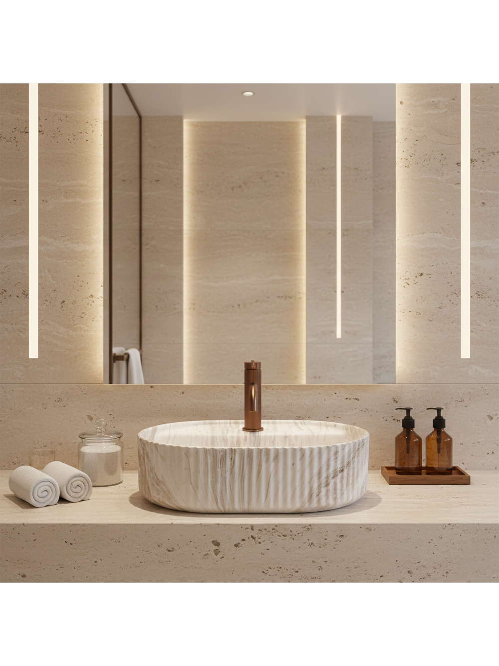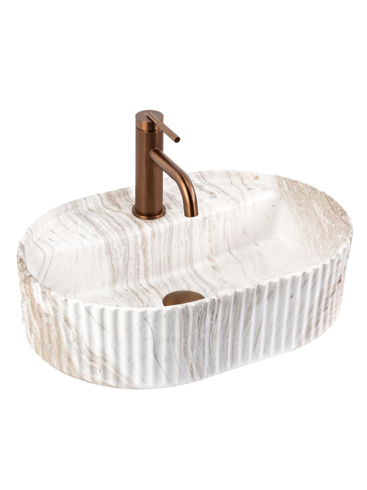 Lavoarul Rea Marcela 50 pe blat, varianta Kallisto, aduce un accent luminos și elegant în baie, oferind un efect de piatră naturală cu venaturi expresive. Culoarea crem-albă este îmbogățită cu nuanțe calde de bej și caramel, adăugând un confort vizual și un aer premium spațiului. Această combinație cromatică se potrivește ideal cu lemnul, blaturile deschise și suprafețele sinterizate în tonuri de nisip, încadrându-se perfect și cu bateriile în nuanțe contrastante de negru, grafit sau cupru.