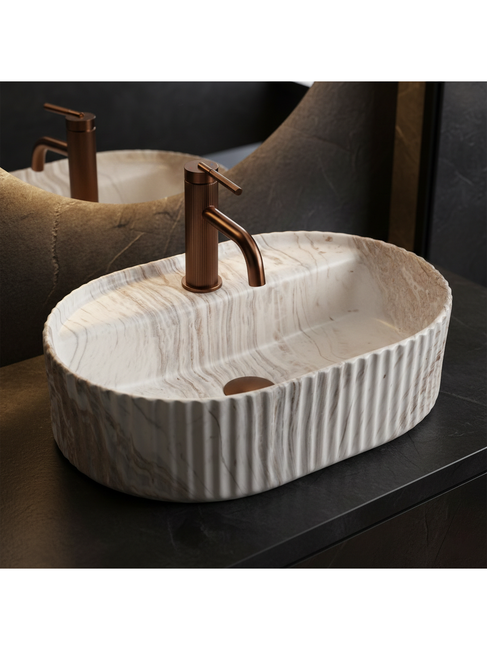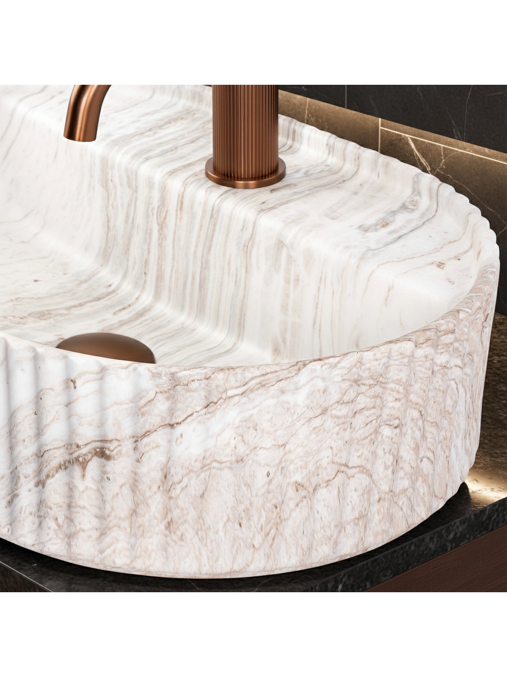 Forma lavoarului atrage atenția prin canelurile verticale caracteristice de pe exterior, evidențiind stilul său de design și conferindu-i un aspect decorativ rafinat. Interiorul cuvei este neted și confortabil profilat, facilitând utilizarea zilnică și curățarea. Ceramica sanitară oferă un finisaj plăcut și rafinat, iar modelul Kallisto, cu tranziții tonale naturale și venaturi discrete, conferă o senzație de profunzime și un design unic, reflectând frumos lumina.