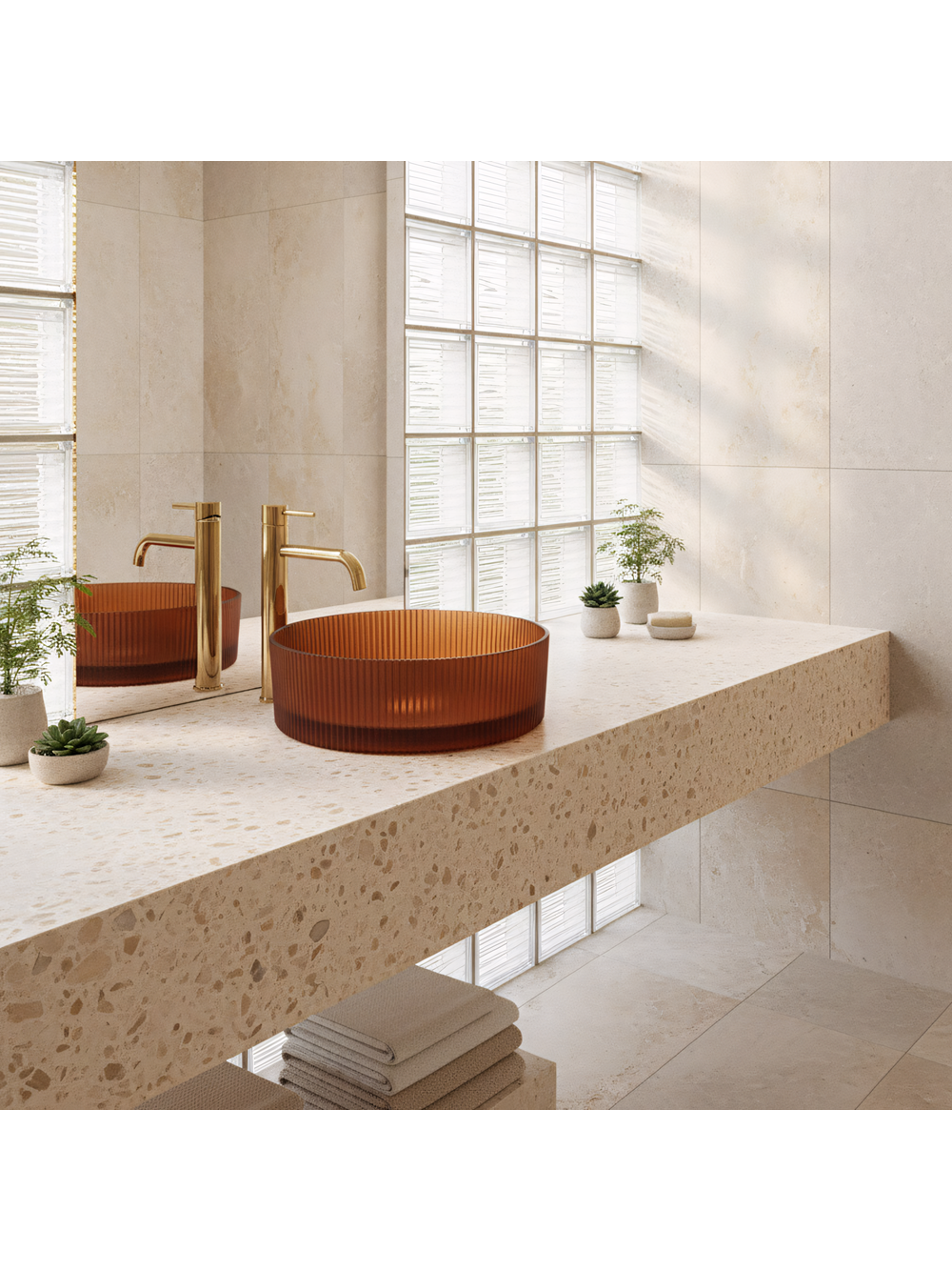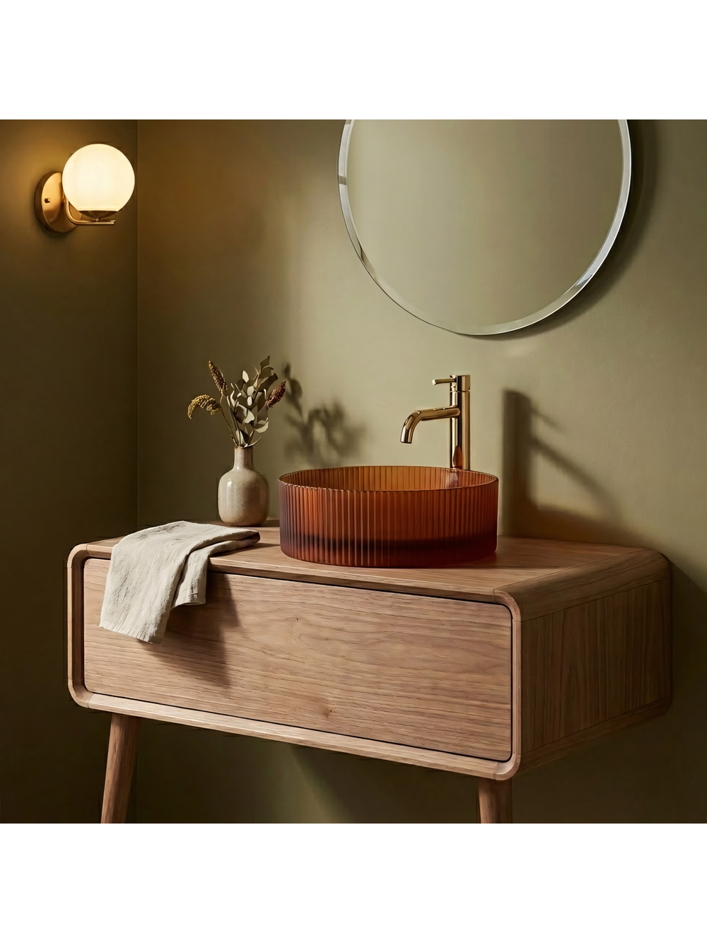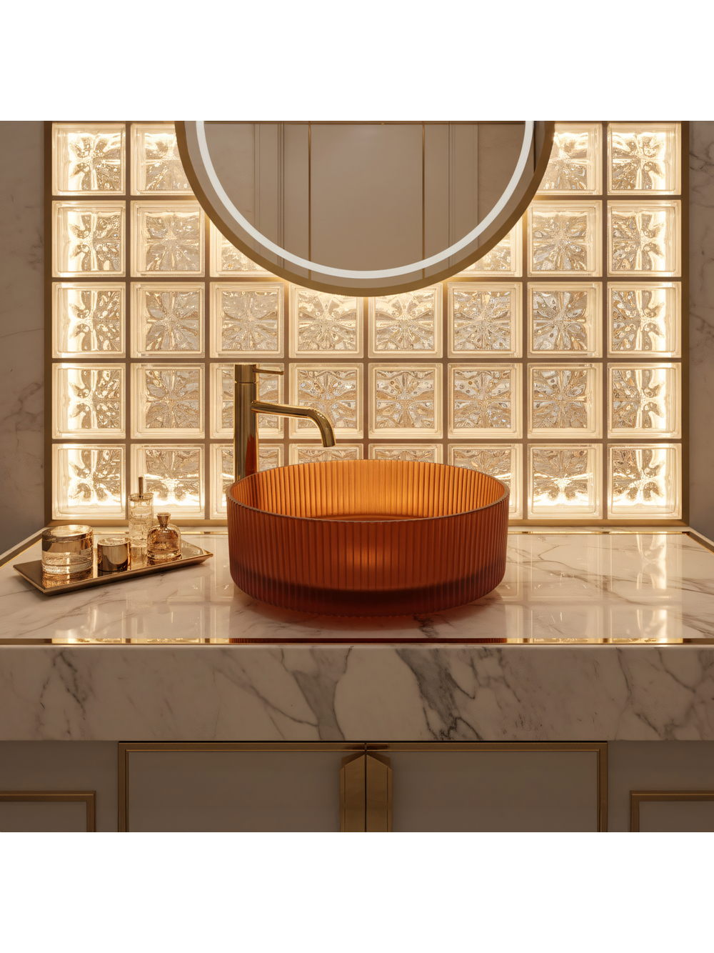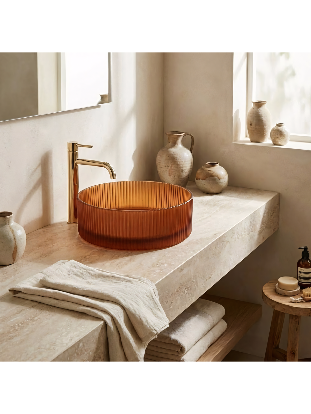 Adăugați eleganță băii dvs. cu lavoarul pe blat Rea Suri. Acest model distinctiv se remarcă prin textura sa striată și culoarea caldă de un maro ambrat cu nuanțe ușor fumurii. Fabricat din sticlă securizată de înaltă calitate, lavoarul îmbină delicat formele cu durabilitatea excelentă în utilizare zilnică. Structură striată – designul cu caneluri verticale de pe exteriorul cuvei conferă un aspect unic și clasic. Sticlă securizată – material rezistent la șocuri mecanice și schimbări de temperatură. Culoare Maro Ambrat – o nuanță caldă și fumurie, ce aduce un accent cromatic expresiv. Finisaj mat – suprafață satinată, estetică și practică pentru utilizare zilnică. Montaj pe blat – permite instalarea pe mobilier sau blat, punând în valoare frumusețea întregii forme a lavoarului. Utilizare versatilă – forma geometrică și culoarea lui se potrivesc în amenajări vintage, boho sau moderne. Lavoarul din sticlă Rea Suri combină rezistența materialului cu un design decorativ. Sticla mată, striată, în nuanță ambrată este o alegere solidă și estetică, completând perfect zona lavoarului cu un caracter coerent, indiferent de stilul ales pentru baie.