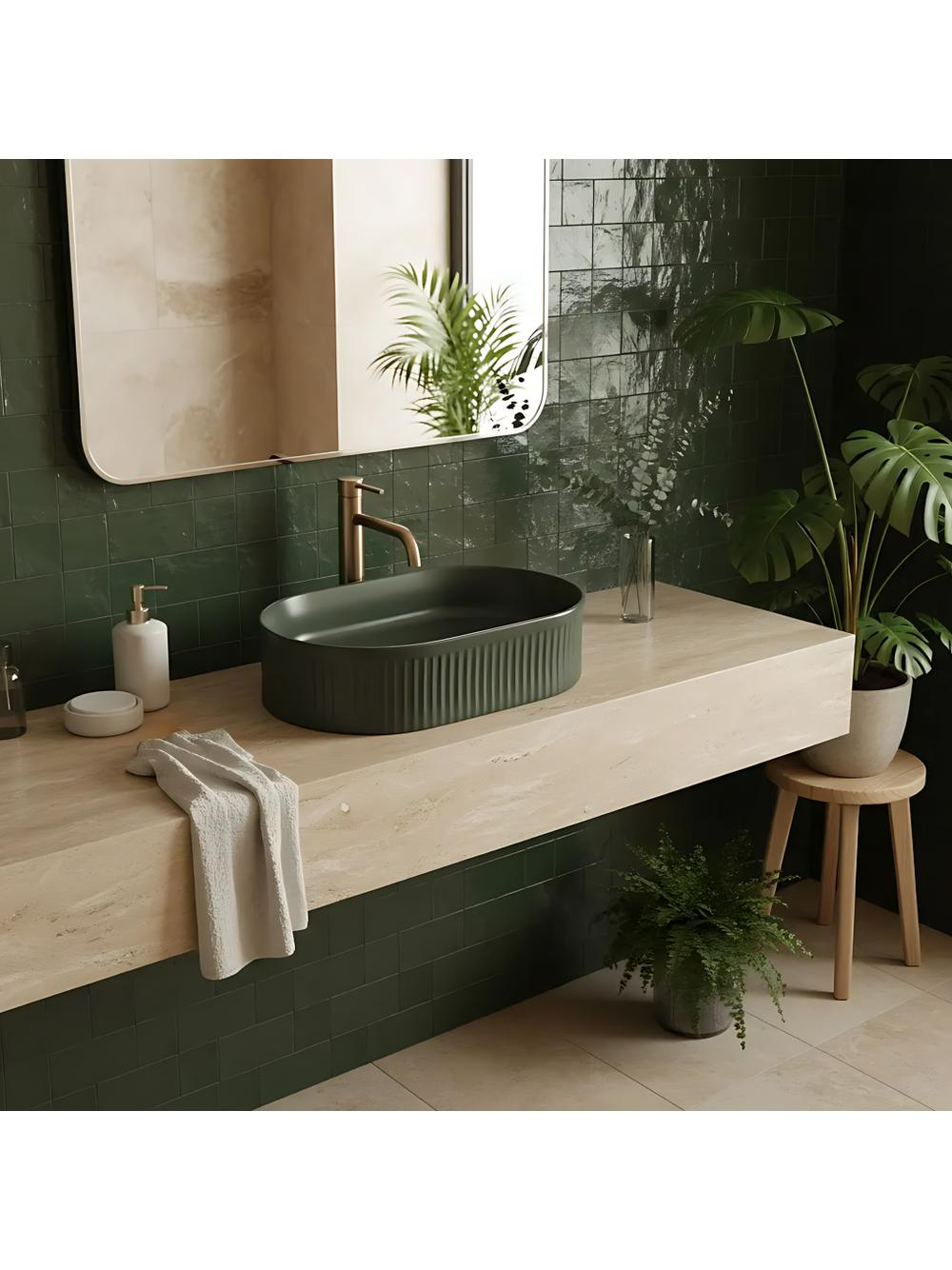 Ești în căutarea unui accent elegant pentru baia ta modernă? Descoperă lavoarul de blat Rea Vanda în nuanța profundă Olive Matt. Acesta aduce în prim plan cele mai noi tendințe de design alături de o funcționalitate ridicată. Fabricat din ceramică sanitară de înaltă calitate, acest lavoar se remarcă prin suprafața sa mată și textura striată verticală decorativă.