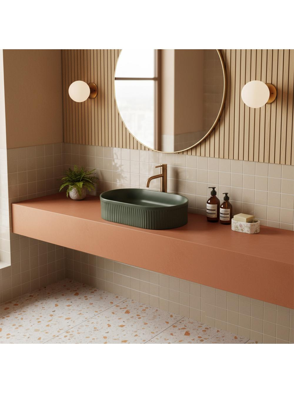 Culoarea Olive Matt, un ton elegant de verde măsliniu mat, oferă unicitate și rafinament băii tale. Suprafața exterioară striată creează un efect vizual modern și adaugă o notă de eleganță. Ceramică sanitară de înaltă calitate, acest lavoar este durabil, ușor de întreținut și rezistent la uzura zilnică.