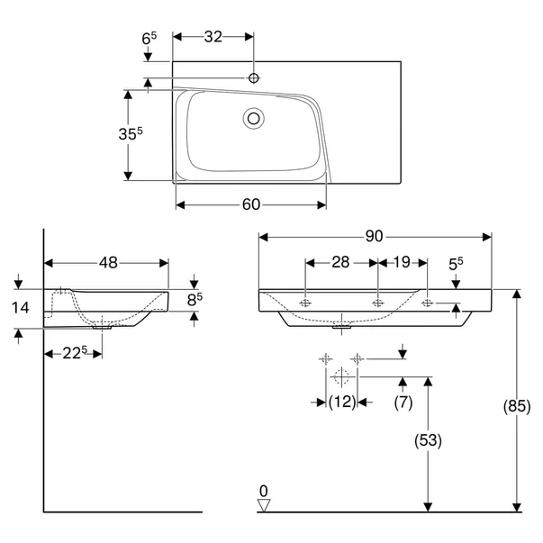 Specificatii tehnice Lavoar pe mobilier Geberit Xeno2 cu blat dreapta fara orificiu baterie 90 cm alb: