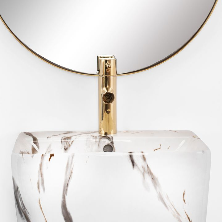 Lavoarul de ceramică de sine stătător Aris aduce un design modern și elegant în baie. Cu forma sa clasică pătrată și accente practice, acest produs monolitic este un element de fitinguri potrivit pentru orice baie elegantă. Creează un spațiu funcțional și stilat cu acest lavoar unic în formă de piedestal.