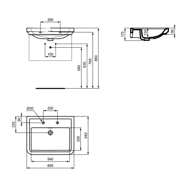 Specificatii tehnice Lavoar pe mobilier Ideal Standard Atelier Calla alb lucios 67 cm cu 2 orificii baterie: