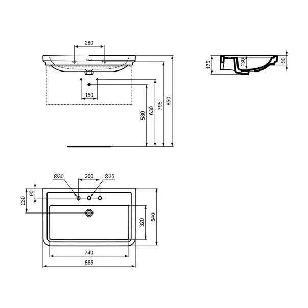 Specificatii tehnice Lavoar pe mobilier Ideal Standard Atelier Calla alb lucios 87 cm cu 3 orificii baterie: