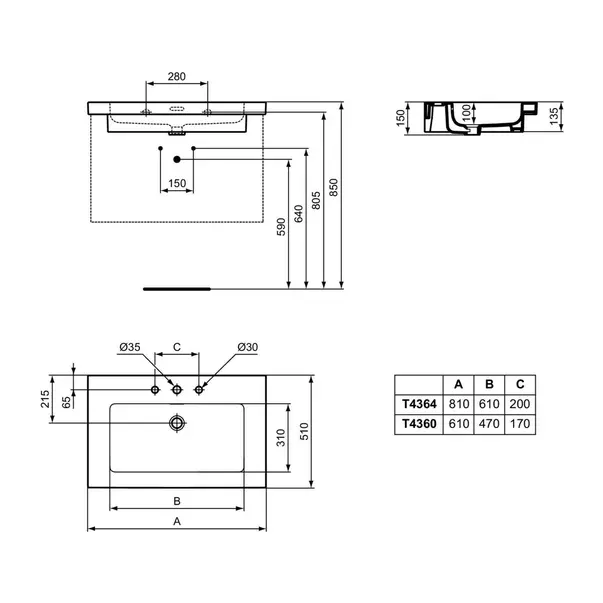 Specificatii tehnice Lavoar pe mobilier Ideal Standard Atelier Extra alb lucios cu 3 orificii baterie 81 cm:
