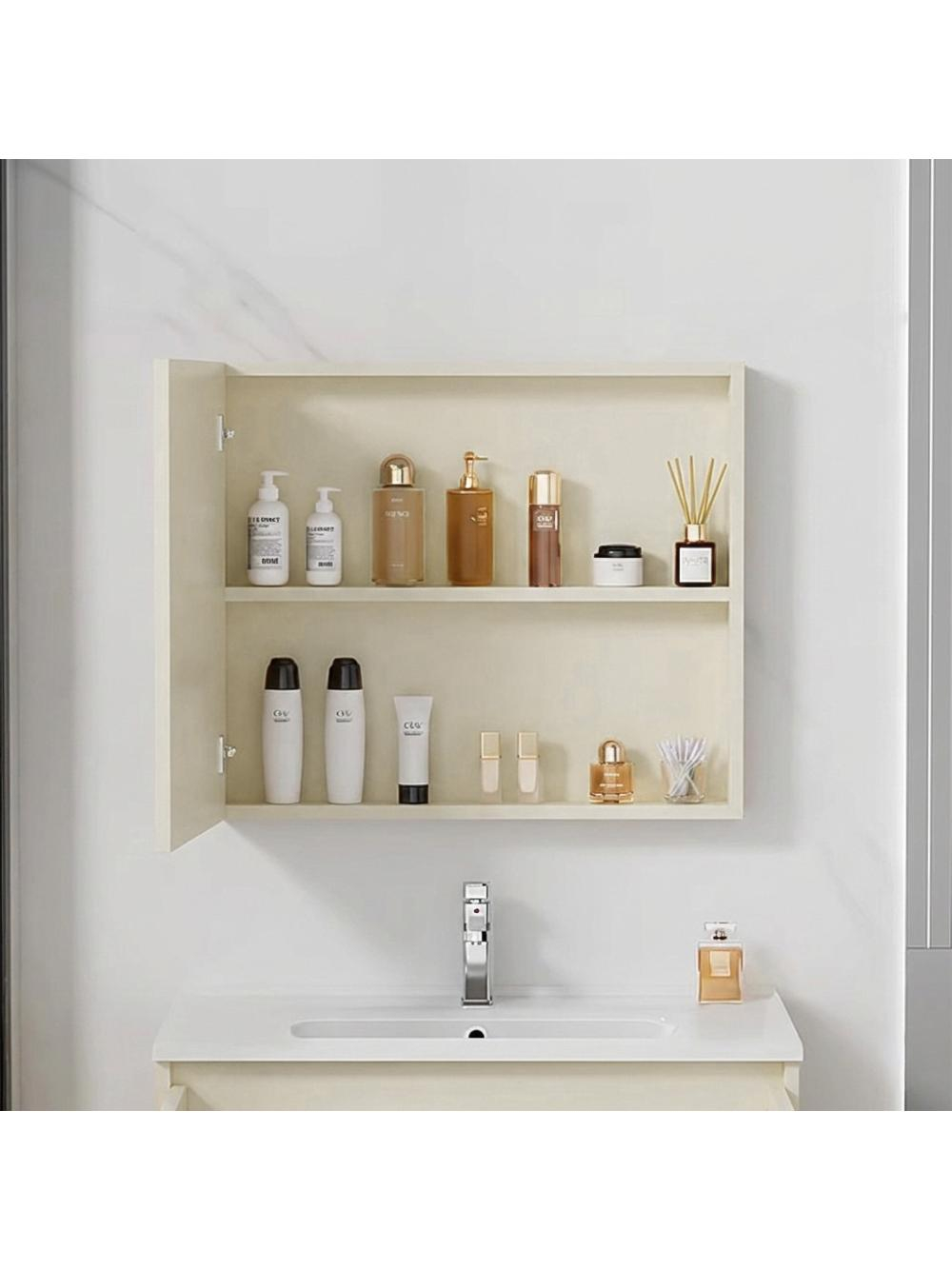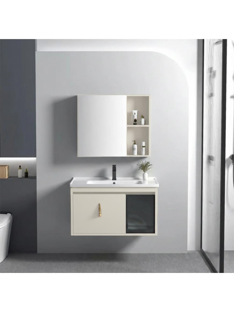 Dulapul sub lavoar - suspendat, oferă un spațiu practic de depozitare, contribuind la menținerea ordinei și la crearea unui aspect unitar în interior. Lavoarul din ceramică este potrivit pentru dulap, având un orificiu pentru bateria de apă, facilitează igiena zilnică. Dulapul cu oglindă este un element funcțional ce include polite pentru cosmeticele și accesoriile esențiale, ajutând la organizarea eficientă a spațiului de deasupra lavoarului.