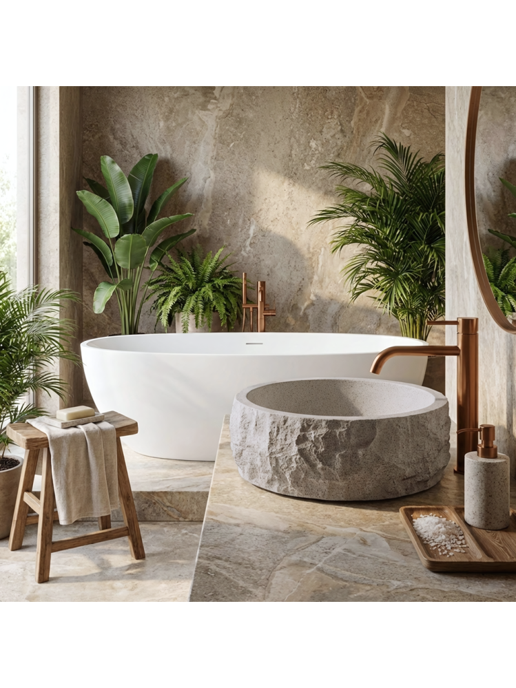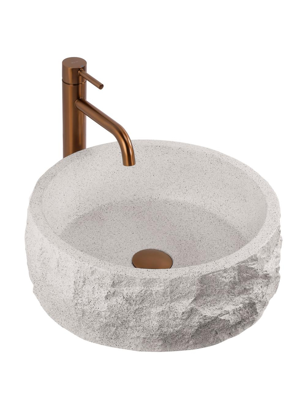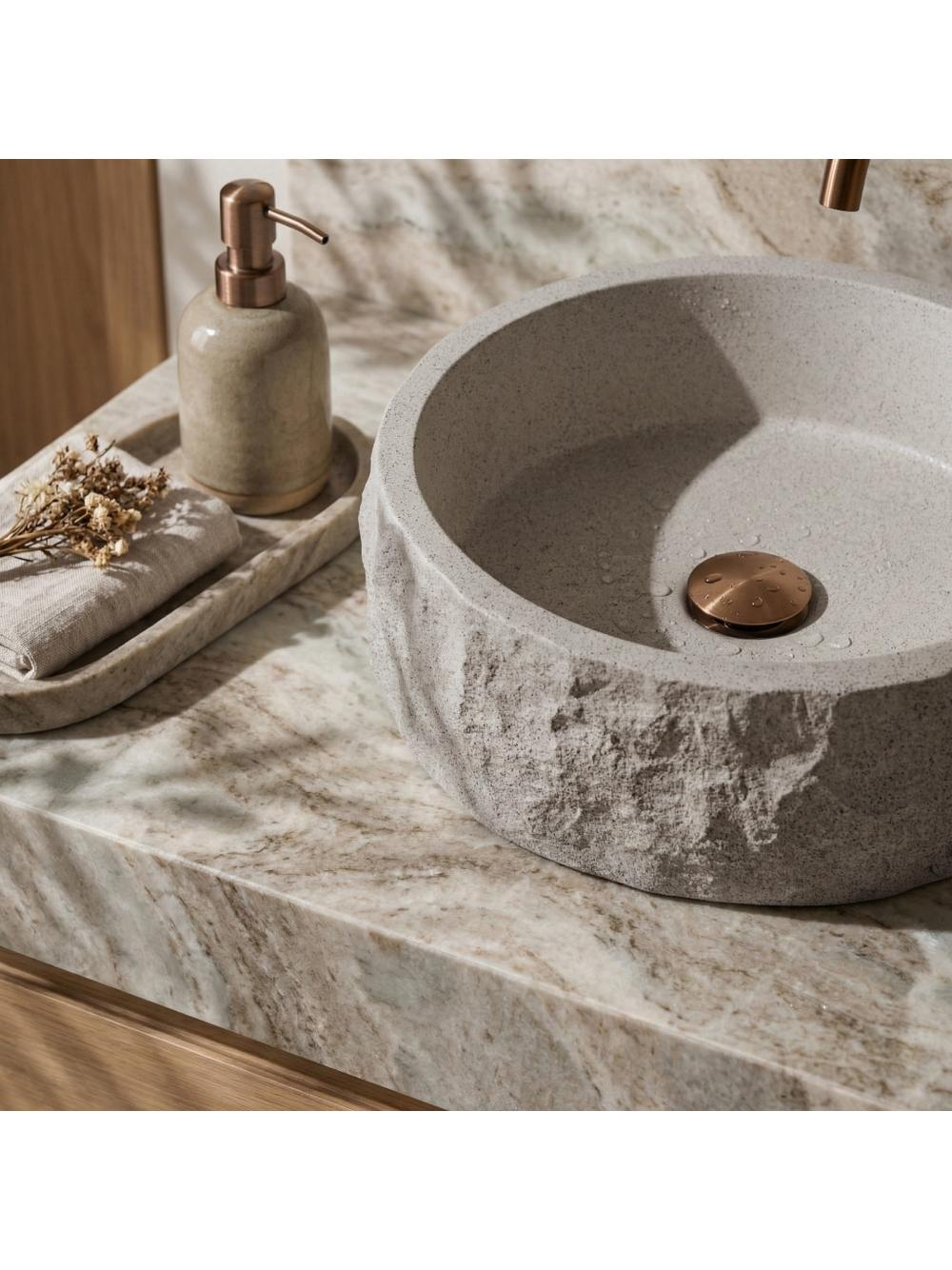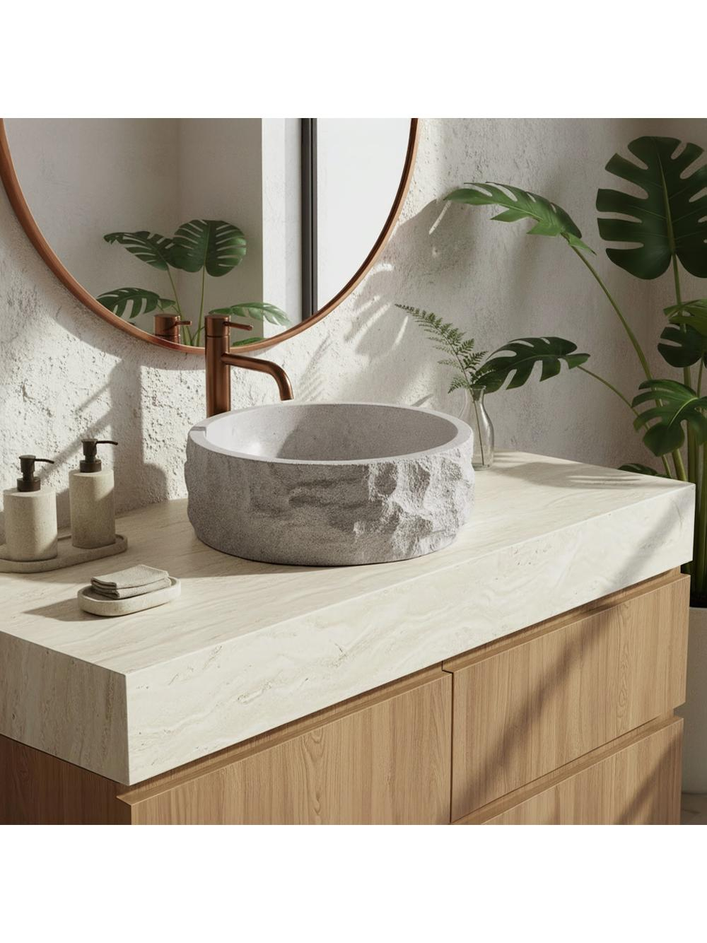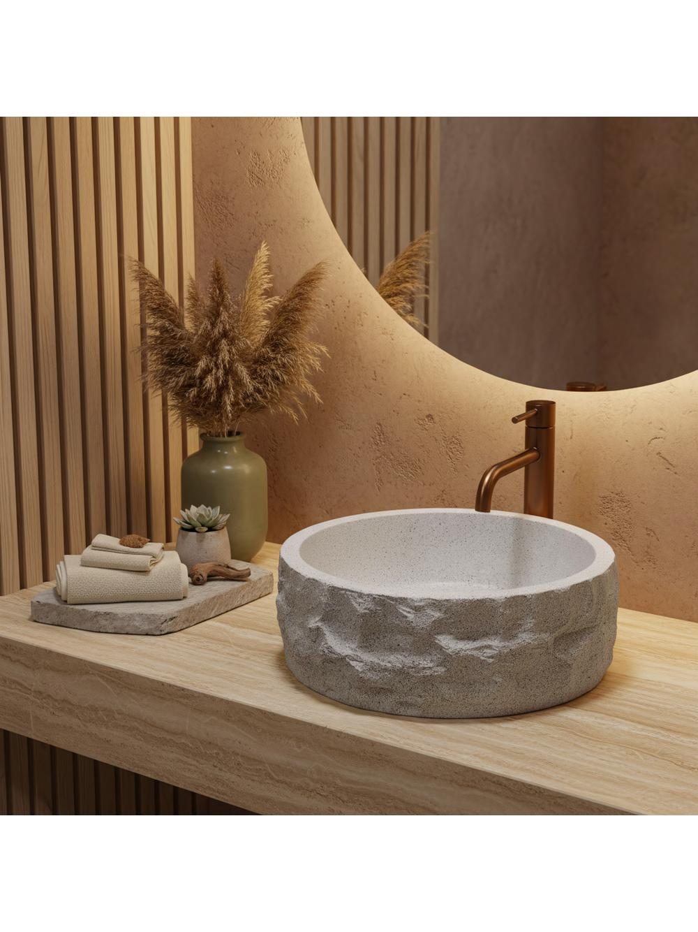 Textura de piatră spartă a cuvei aduce un aspect special și artizanal, în timp ce interiorul neted permite o scurgere eficientă a apei și o întreținere rapidă și fără dificultăți. Forma rotundă și montajul pe blat fac acest lavoar practic și potrivit pentru diverse stiluri de design interior.