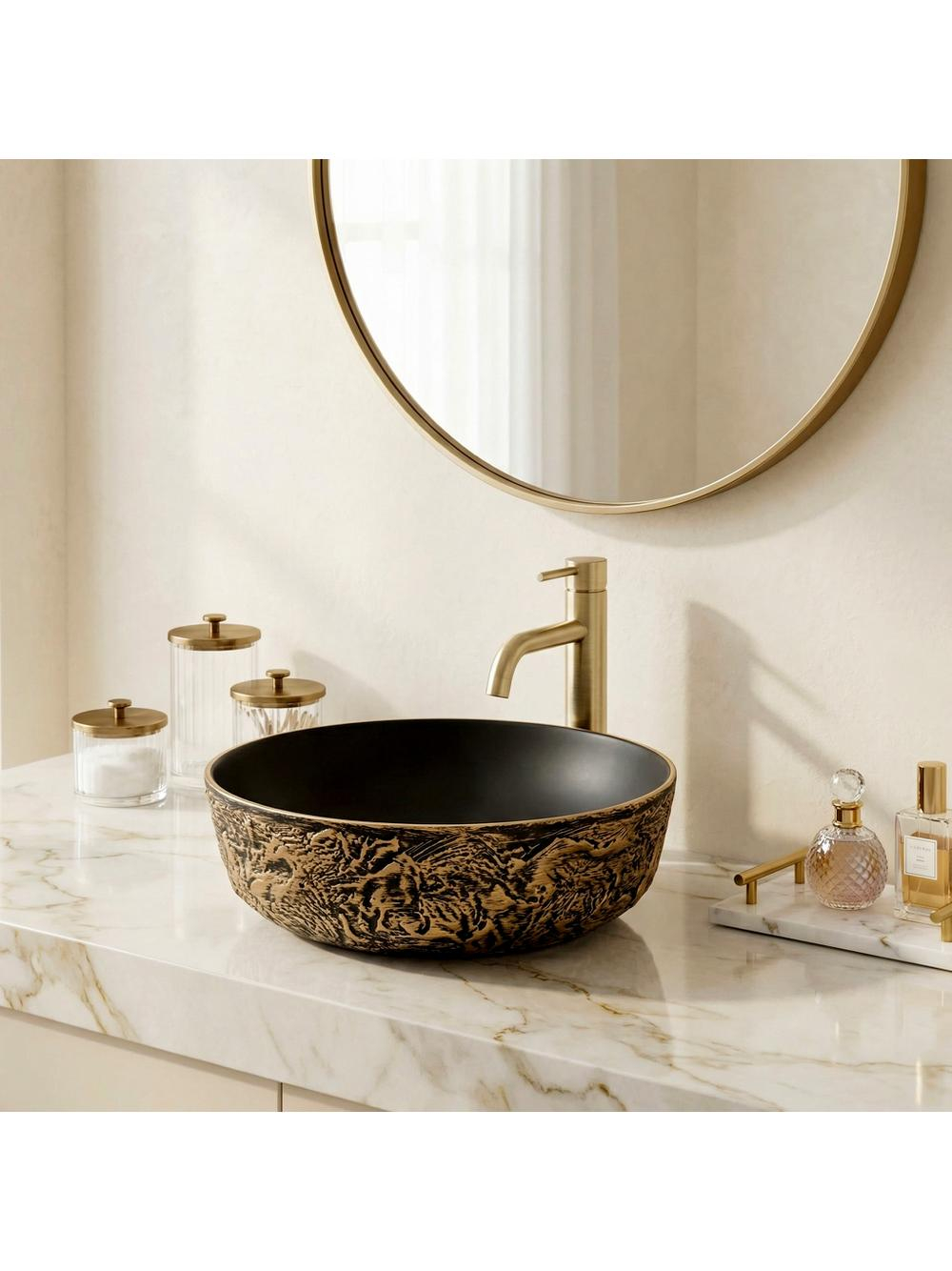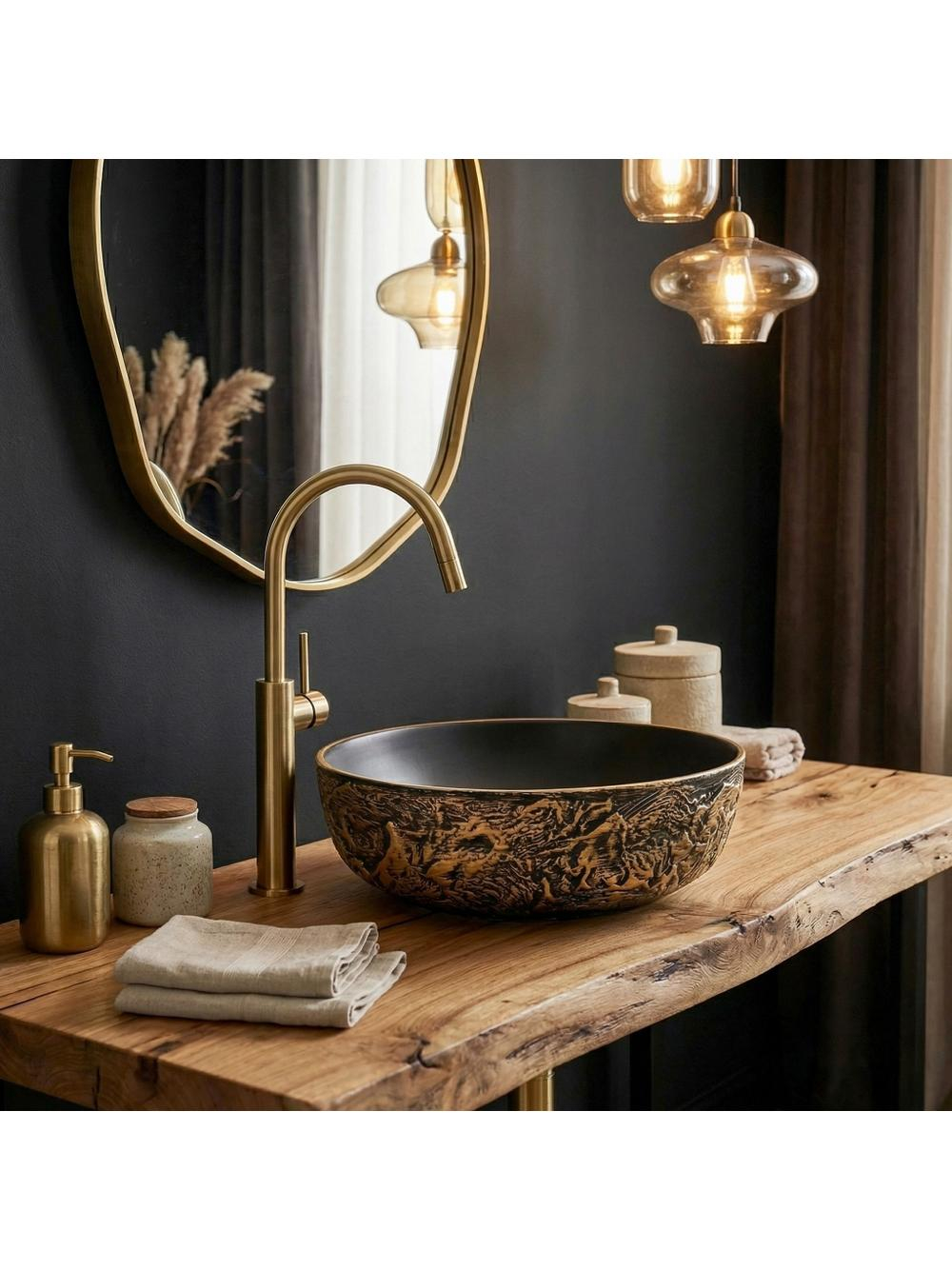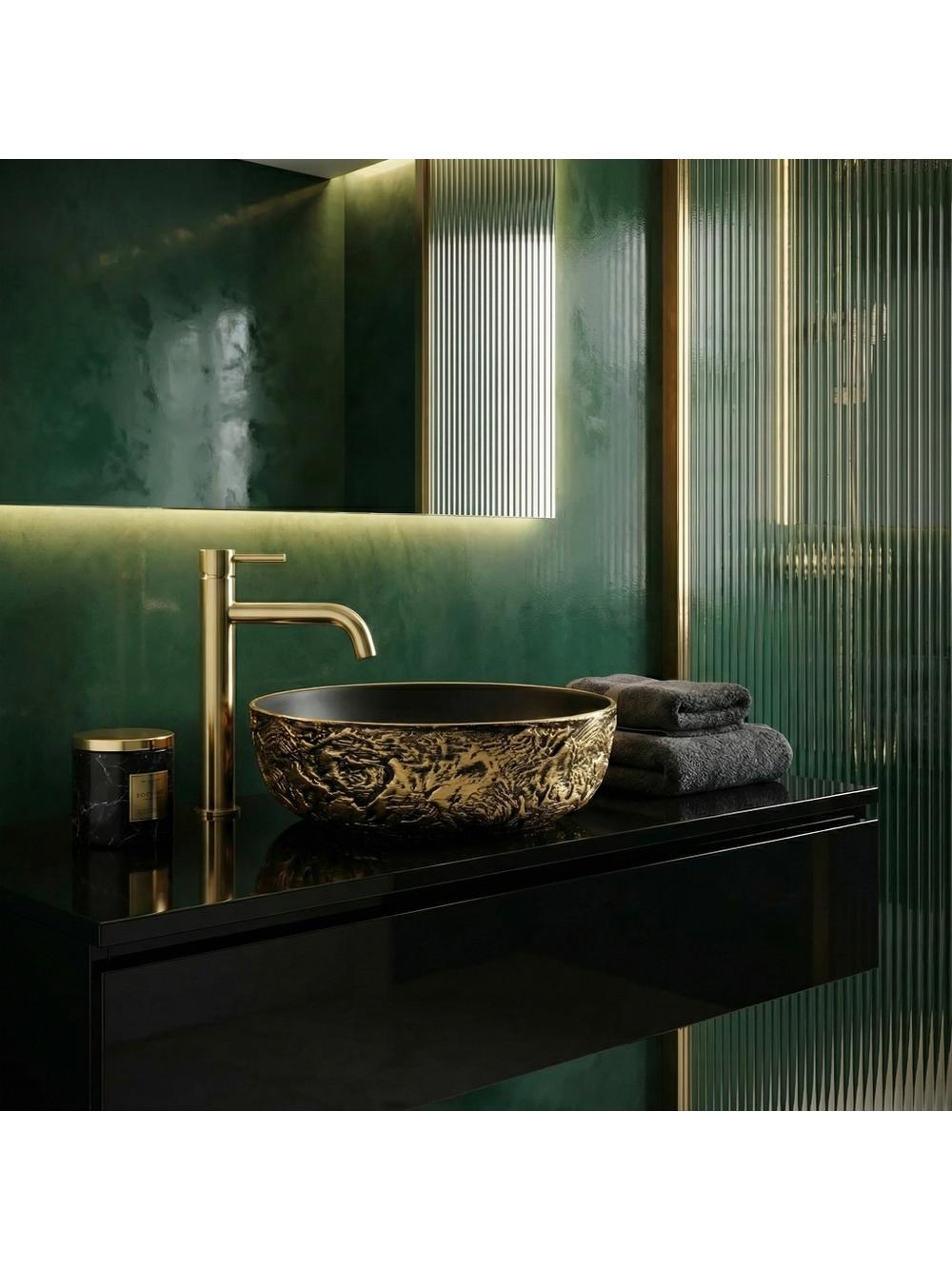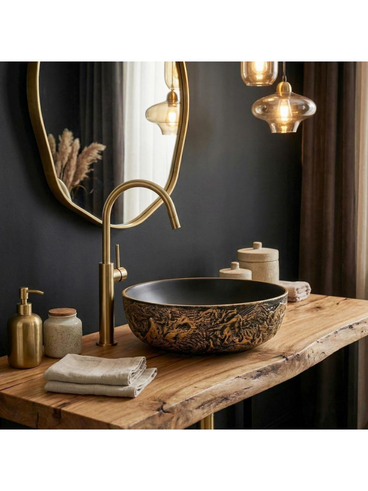 Adăugați un strop de lux în baia dvs. cu lavoarul rotund pe blat Rea Babilon Gold. Această piesă unică din ceramică impresionează prin contrastul său impresionant - o carcasă brută, sculptată și un interior perfect neted, minimalist. Textura exterioară pronunțată de culoare negru-auriu atrage privirile cu caneluri adânci, neregulate. Accentele de aur antic pe fond negru creează un efect tridimensional captivant. Interiorul neted de culoare neagră mat oferă un contrast spectaculos cu exteriorul său brut, aducând un finisaj elegant și profund. Fabricat din ceramică de înaltă calitate, acest lavoar garantează o durabilitate pe termen lung. Designul său permite montarea pe blat, punând în valoare caracterele sale sculpturale și bijuterie din spațiul băii dvs. Cu un design potrivit pentru interioare îndrăznețe în stil industrial, glamour sau modern dark, lavoarul ceramic Babilon Gold va deveni punctul central distinctiv și luxuriant al zonei dvs. de igienizare.