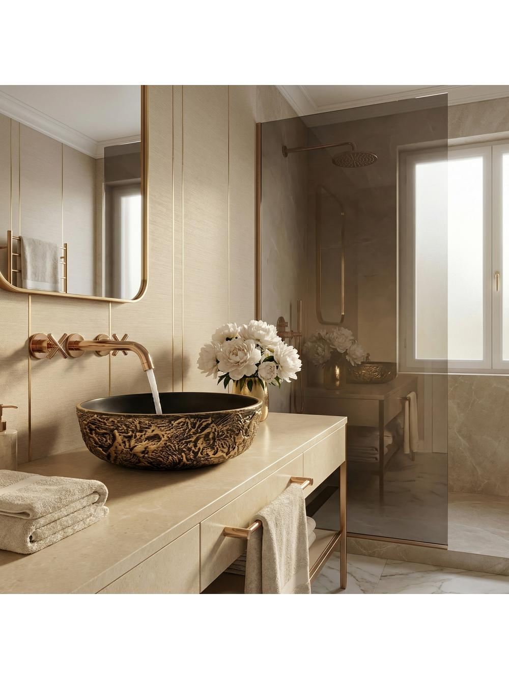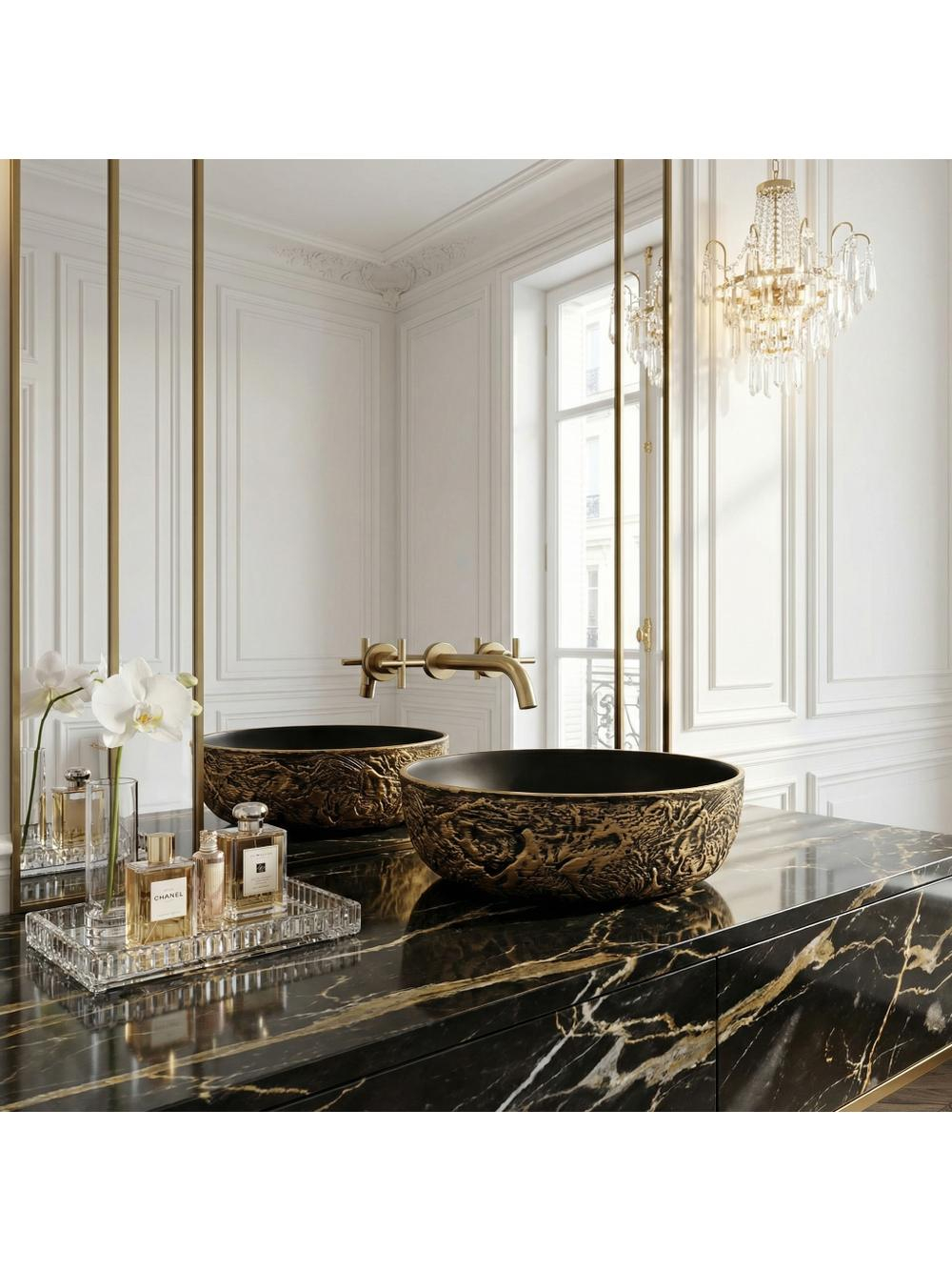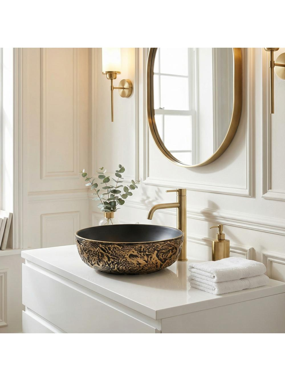 Adăugați un strop de lux în baia dvs. cu lavoarul rotund pe blat Rea Babilon Gold. Această piesă unică din ceramică impresionează prin contrastul său impresionant - o carcasă brută, sculptată și un interior perfect neted, minimalist. Textura exterioară pronunțată de culoare negru-auriu atrage privirile cu caneluri adânci, neregulate. Accentele de aur antic pe fond negru creează un efect tridimensional captivant. Interiorul neted de culoare neagră mat oferă un contrast spectaculos cu exteriorul său brut, aducând un finisaj elegant și profund. Fabricat din ceramică de înaltă calitate, acest lavoar garantează o durabilitate pe termen lung. Designul său permite montarea pe blat, punând în valoare caracterele sale sculpturale și bijuterie din spațiul băii dvs. Cu un design potrivit pentru interioare îndrăznețe în stil industrial, glamour sau modern dark, lavoarul ceramic Babilon Gold va deveni punctul central distinctiv și luxuriant al zonei dvs. de igienizare.