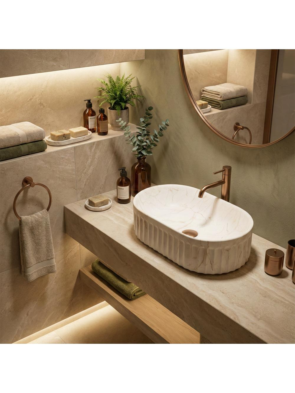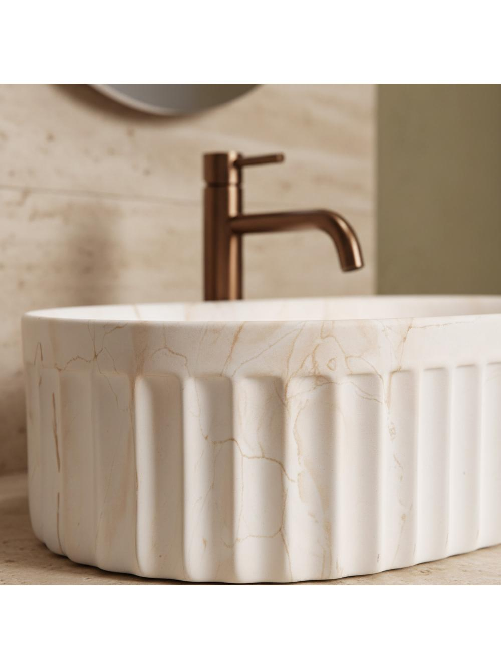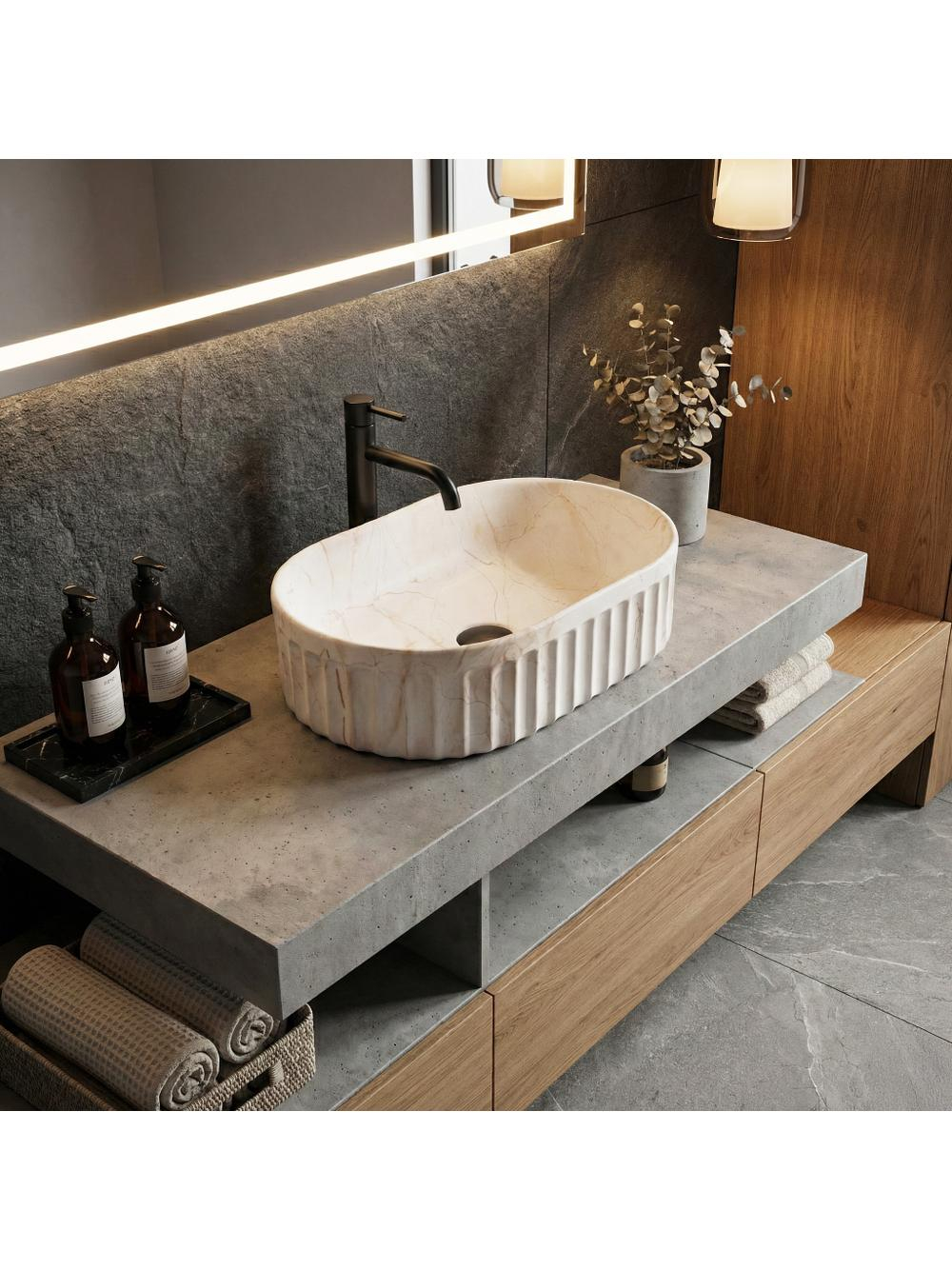 Experimentează un design unic și o funcționalitate practică cu lavoarul pe blat Georgia. Această piesă combină ceramică durabilă, verificată în timp, cu cele mai recente tendințe în design interior. Este caracterizat de structura exterioară canelată și finisajul mat subtil cu model de piatră, oferind un aspect modern și expresiv zonei de spălare. Structura canelată adaugă un detaliu la modă care se potrivește perfect cu alte elemente canelate din baie, în timp ce finisajul mat cu motiv de piatră aduce o notă de eleganță și practicitate în utilizare. Cu o construcție din ceramică sanitară durabilă, acest lavoar rezistă la zgârieturi și lovituri pentru a păstra un aspect impecabil ani la rând. Montajul pe blat facilitează instalarea și oferă un confort sporit, iar forma ovală ergonomică permite o curățare rapidă și eficientă. Lavoarul pe blat Georgia este alegerea ideală pentru cei care apreciază elemente originale, dar și funcționale, fiind perfect pentru o baie modernă.