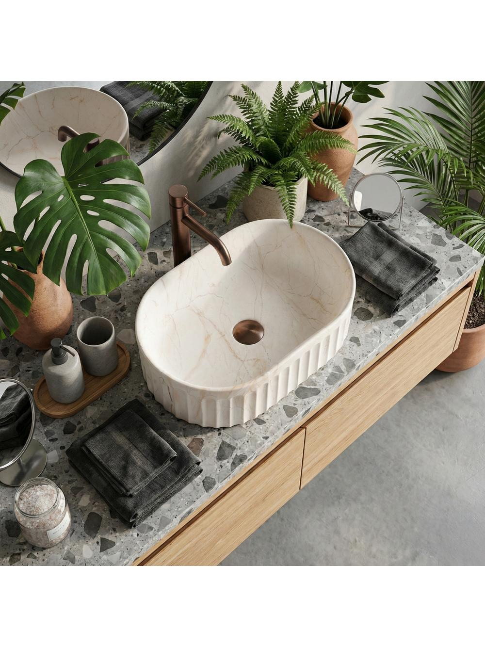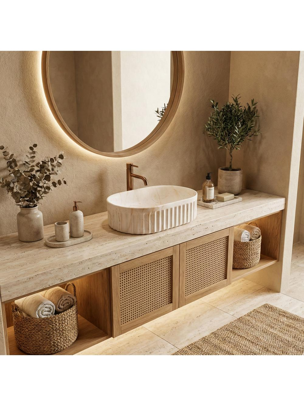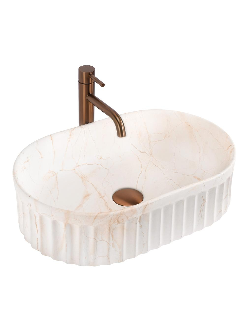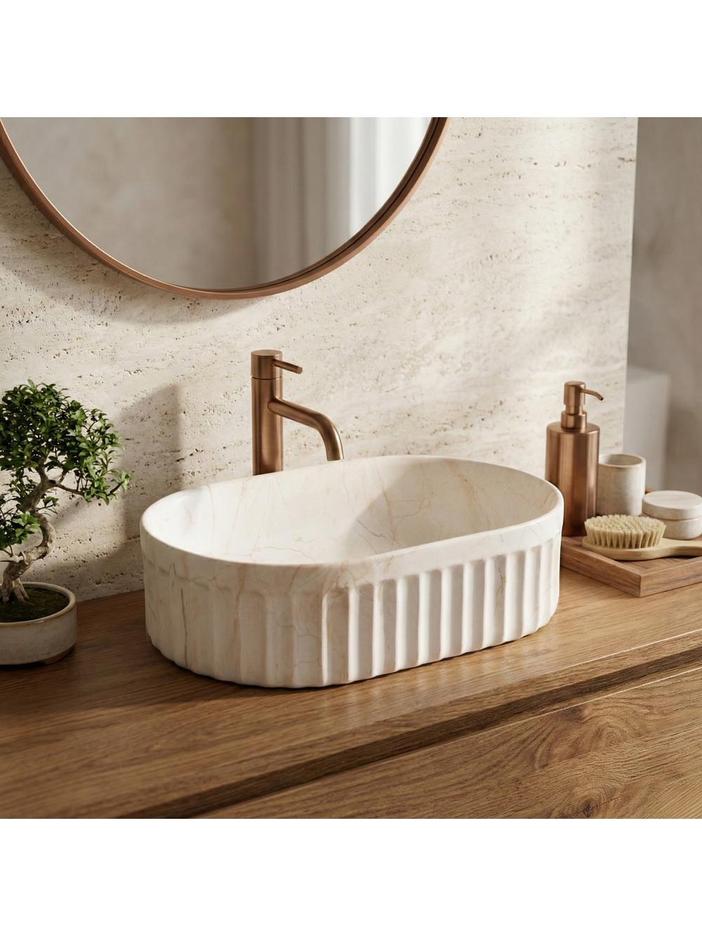 Experimentează un design unic și o funcționalitate practică cu lavoarul pe blat Georgia. Această piesă combină ceramică durabilă, verificată în timp, cu cele mai recente tendințe în design interior. Este caracterizat de structura exterioară canelată și finisajul mat subtil cu model de piatră, oferind un aspect modern și expresiv zonei de spălare. Structura canelată adaugă un detaliu la modă care se potrivește perfect cu alte elemente canelate din baie, în timp ce finisajul mat cu motiv de piatră aduce o notă de eleganță și practicitate în utilizare. Cu o construcție din ceramică sanitară durabilă, acest lavoar rezistă la zgârieturi și lovituri pentru a păstra un aspect impecabil ani la rând. Montajul pe blat facilitează instalarea și oferă un confort sporit, iar forma ovală ergonomică permite o curățare rapidă și eficientă. Lavoarul pe blat Georgia este alegerea ideală pentru cei care apreciază elemente originale, dar și funcționale, fiind perfect pentru o baie modernă.