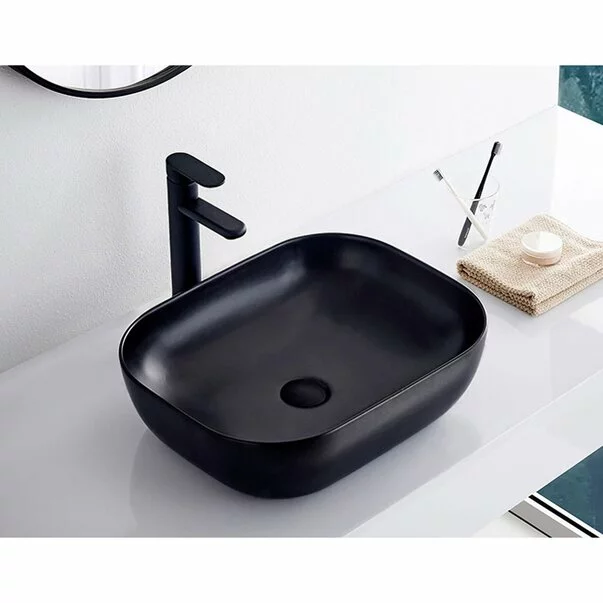 Lavoarul Belinda cu blat negru mat este o alegere frumoasă și funcțională pentru baia ta. Cu o combinație inedită de culori, acest produs va aduce un plus de eleganță și stil în baia ta. Lavoarul este proiectat pentru montarea atât pe blat, cât și pe dulap, fiind realizat dintr-o ceramică de cea mai înaltă calitate, cu un finisaj negru mat care va atrage atenția tuturor. Acesta va completa perfect spațiul din baia ta, păstrând în același timp un aspect impecabil și modern în amenajarea interioară.