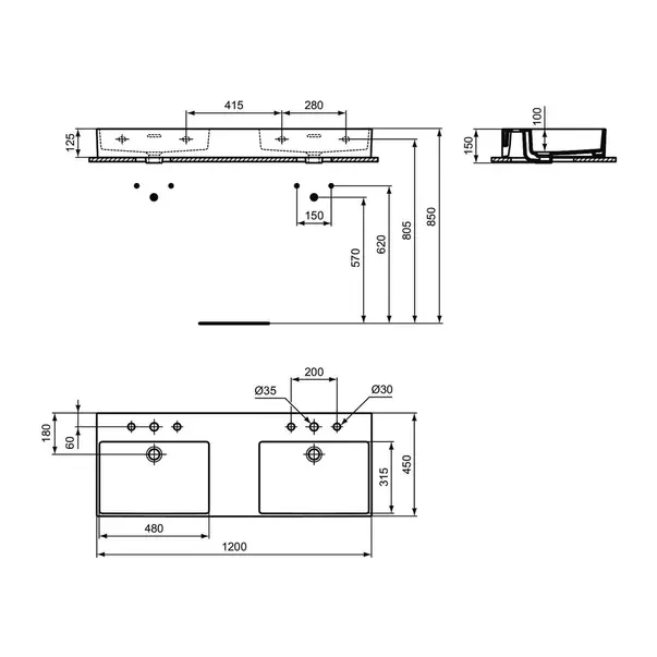 Specificatii tehnice Lavoar suspendat Ideal Standard Extra alb mat cu 3 orificii baterie si preaplin 120 cm: