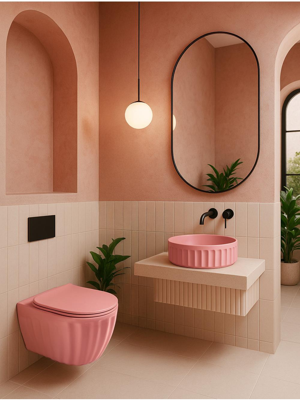 Specficatii tehnice Set: Vas de toaletă suspendat + Lavoar pe blat Rea Light Pink Matt: