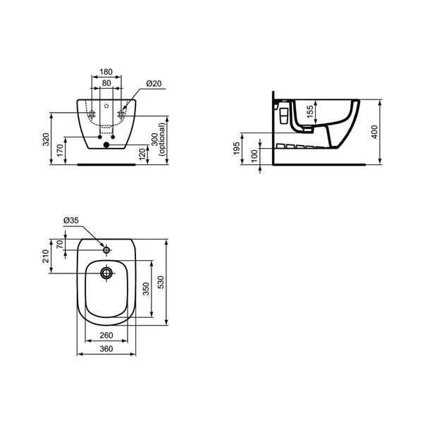 3) Bideu suspendat Ideal Standard Tesi cu montaj suspendat, finisaj negru mat - Silk Black, dimensiuni 360 x 530 mm.