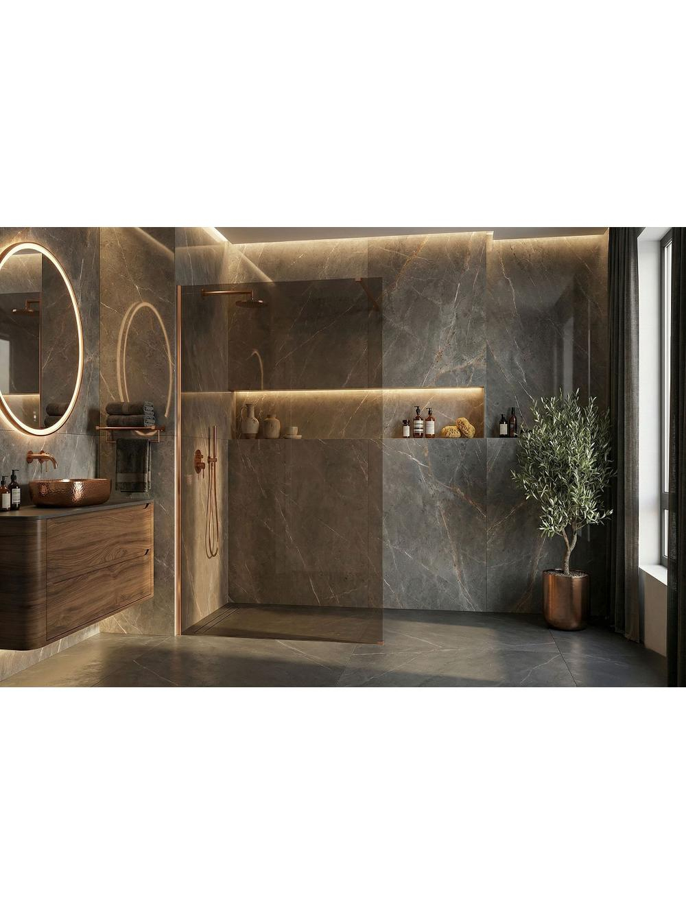 Visați la o baie plină de căldură și lux? Descoperiți peretele de duș walk-in Rea Flexi într-o configurație specială: sticlă în nuanță maro fumuriu și profil în culoarea cupru periat. Acest mix de modern și elegant conferă interiorului un caracter unic. Realizat din sticlă securizată de 8 mm, construcția asigură durabilitate și stabilitate. Sticlă securizată de 8 mm (maro fumuriu) – sigură și elegantă, această sticlă aduce căldură și intimitate spațiului. Profil din aluminiu în cupru periat – finisaj de lux, perfect asortat cu sticla maro. Strat Easy Clean – protejează împotriva depunerilor de săpun și calcar. Bară stabilizatoare de 120 cm ajustabilă și montaj universal. Construcție Walk-In – acces deschis, fără elemente mobile, pentru confort și fiabilitate. Peretele de duș Rea Flexi este alegerea perfectă pentru cei care caută un stil rafinat. Detaliile din cupru și sticla maro creează o atmosferă aparte în zona de duș. Cu stratul Easy Clean și materiale solide, acest produs îmbină estetica de înaltă clasă cu funcționalitatea zilnică.